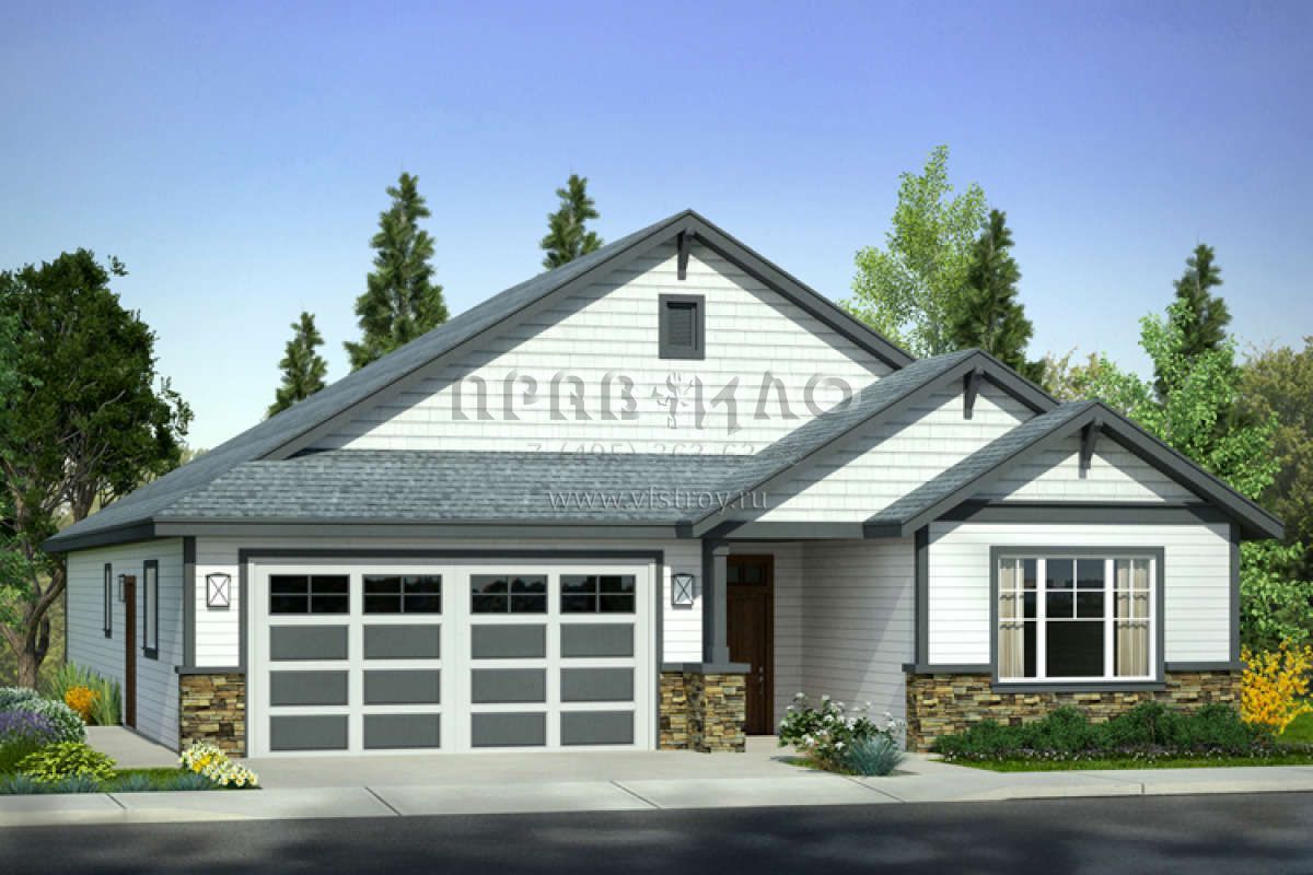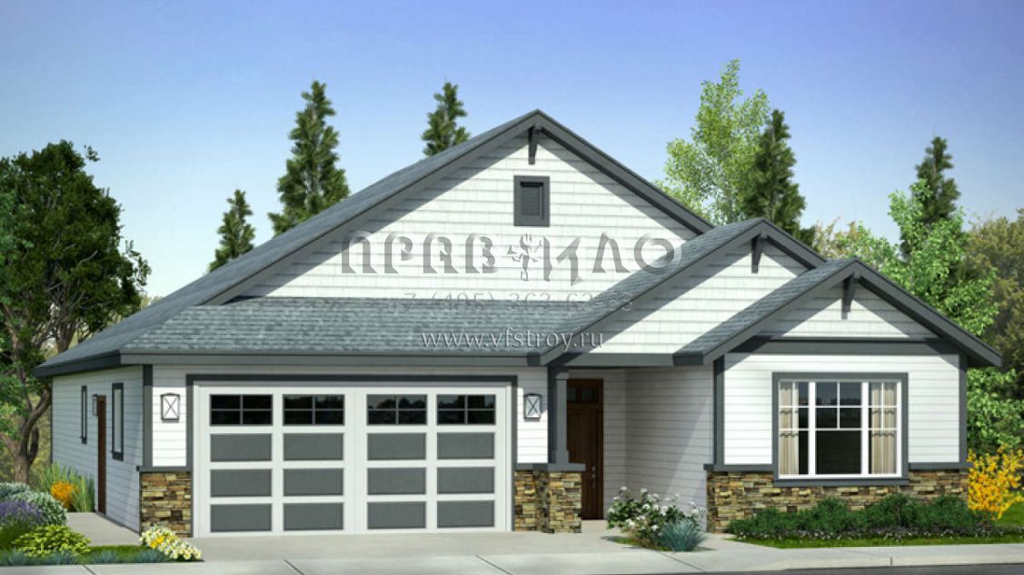 Это проект одноэтажного дома с гаражом на две машины жилой площадью 167 кв.м. Длина дома 21.3 м, ширина 12.8 м, высота 6.7 м. В доме три спальни и два санузла.