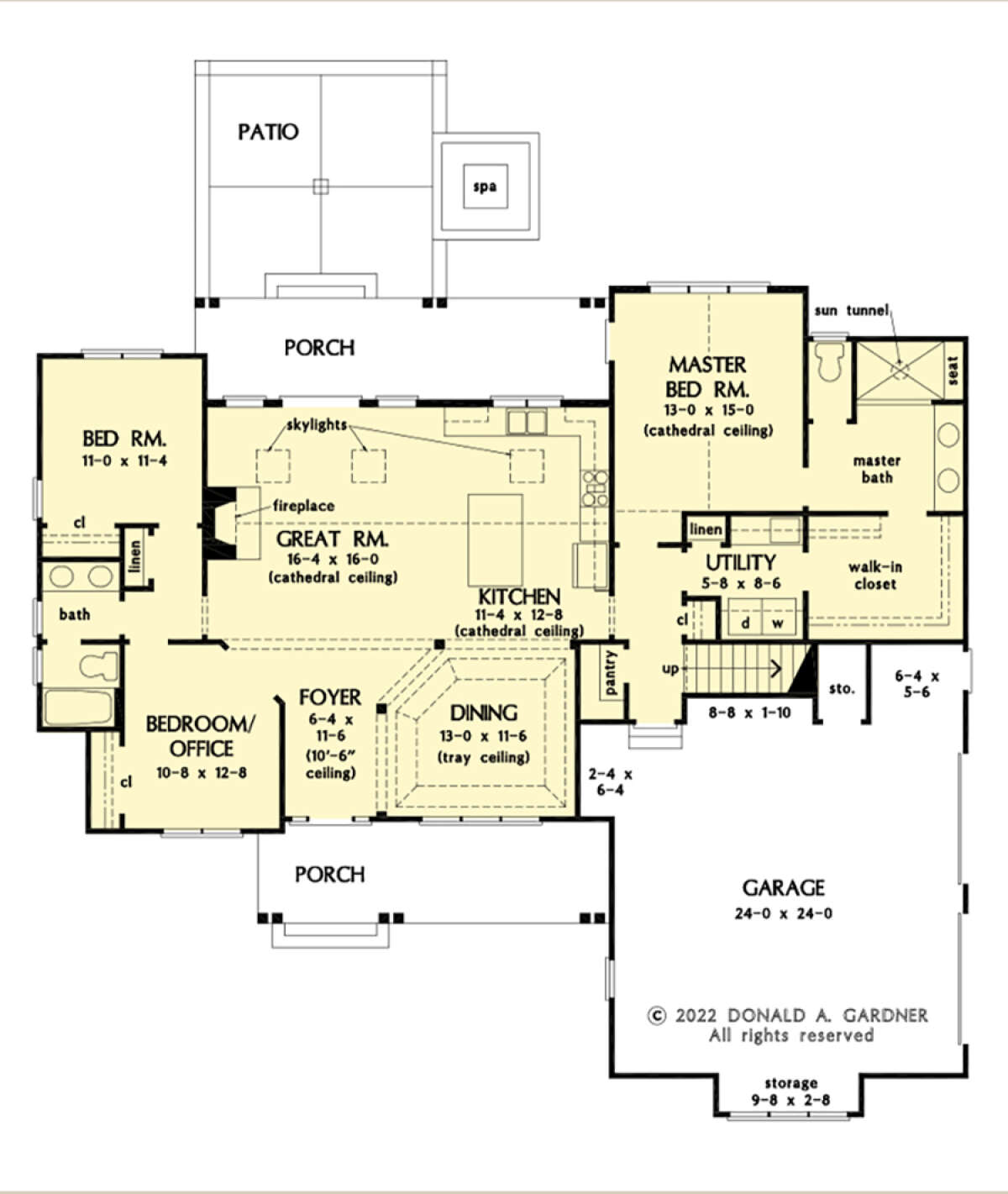 Это проект одноэтажного дома с гаражом на две машины жилой площадью 168 кв.м. Длина дома 17.4 м, ширина 19.5 м, высота 7.6 м. В доме три спальни и два санузла.