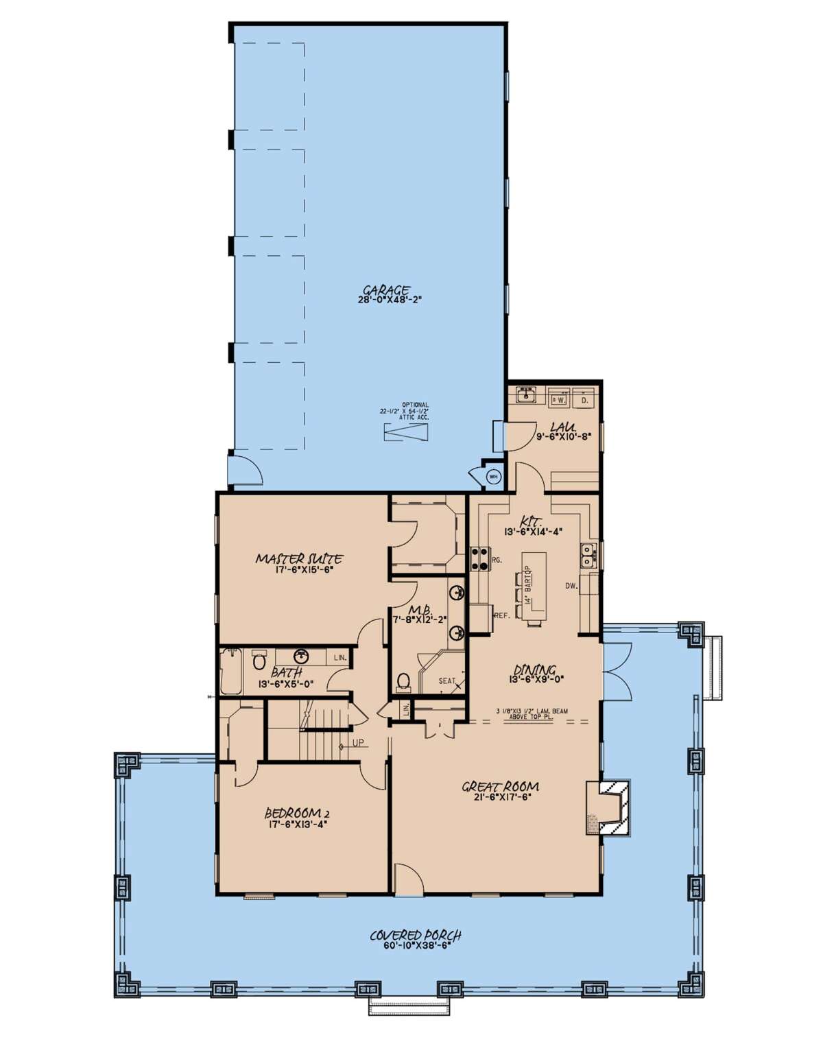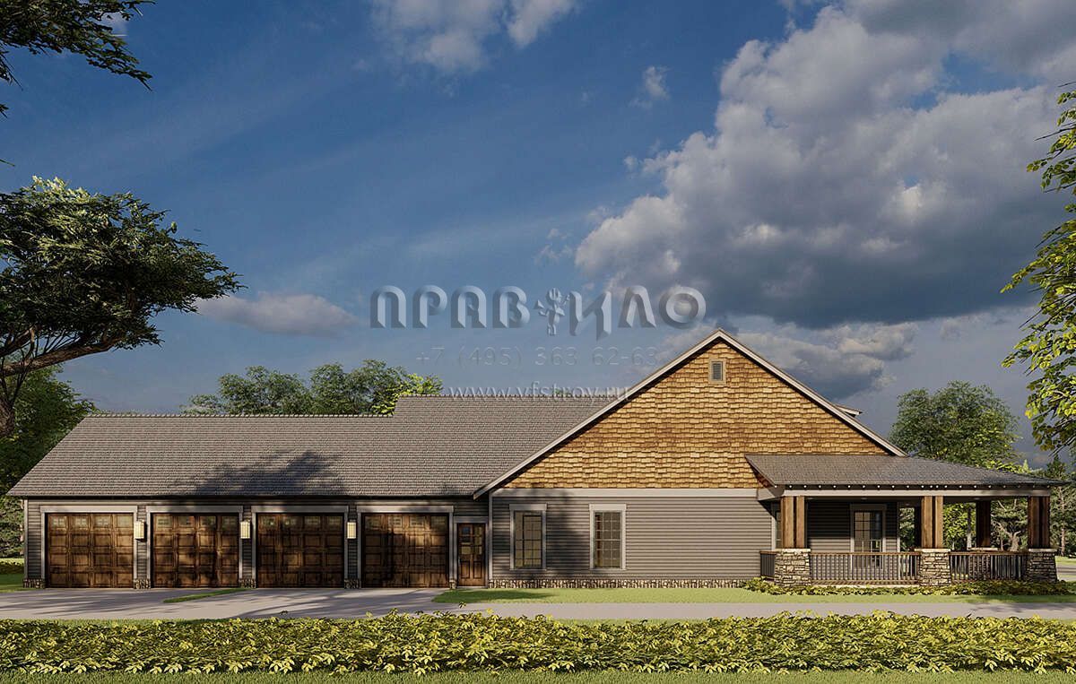 Это проект одноэтажного дома с гаражом на три и более машин жилой площадью 168 кв.м. Длина дома 30.5 м, ширина 18.6 м, высота 7.6 м. В доме две спальни и два санузла.