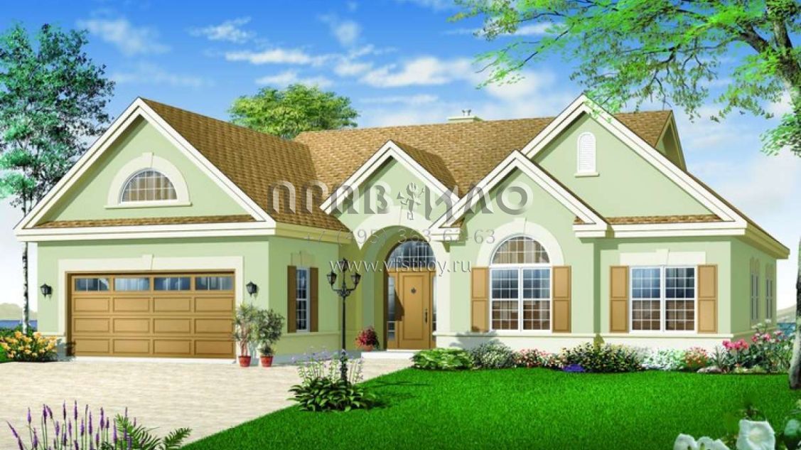 Это проект двухэтажного дома с гаражом на две машины жилой площадью 169 кв.м. Длина дома 17.4 м, ширина 16.5 м, высота 6.7 м. В доме три спальни и два санузла.