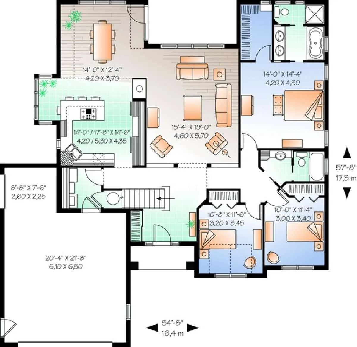 S5-169 (034-00677) Это иностранный проект, для которого требуется адаптация под нормы, действующие в Российской Федерации. Вы видите проект дома в современном стиле. В этом доме сочетаются черты сельской постройки и аскетичность лофта. Внутри жильцы смогут проводить время с максимальным комфортом. Обратим внимание, что сейчас на планировках все размеры представлены в футах. Для перевода в метры вам необходимо значение в футах умножить на 0,3048.