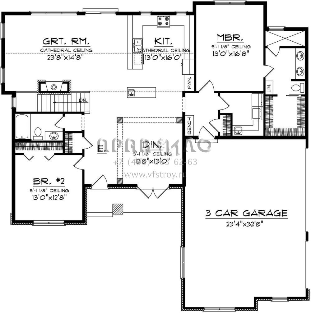Это проект одноэтажного дома с гаражом на три и более машин жилой площадью 170 кв.м. Длина дома 18 м, ширина 18 м, высота 7 м. В доме две спальни и два санузла.