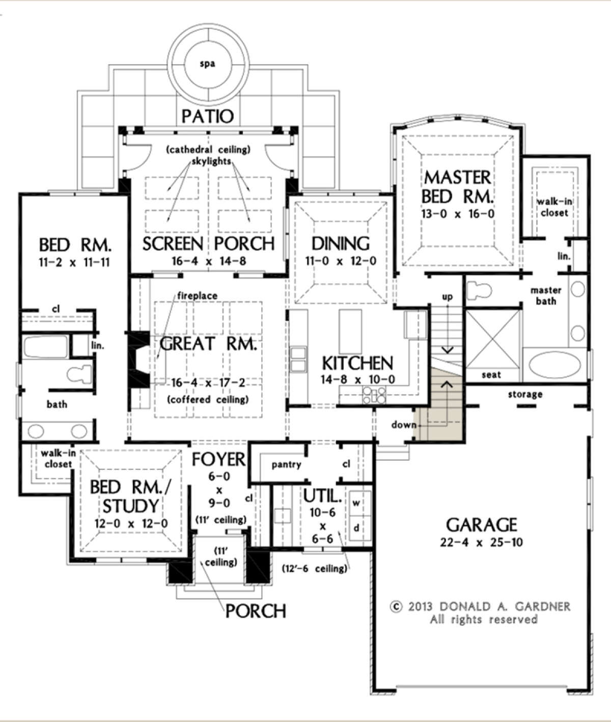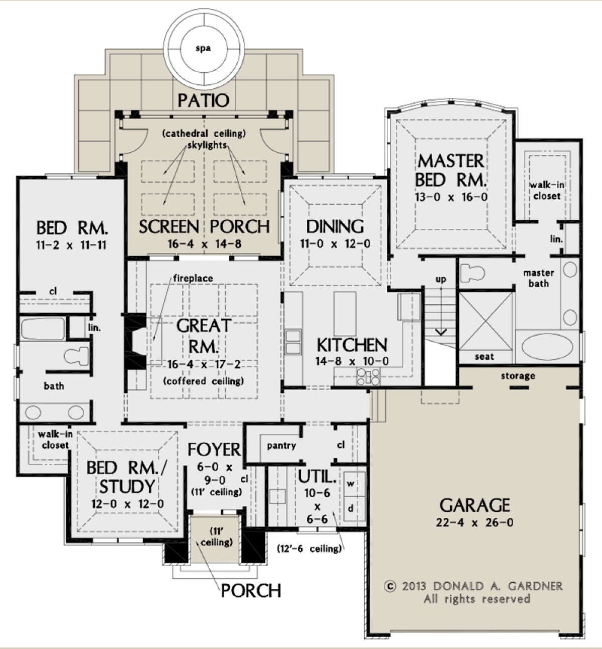 Это проект одноэтажного дома с гаражом на две машины жилой площадью 170 кв.м. Длина дома 17.4 м, ширина 18.3 м, высота 9.1 м. В доме три спальни и два санузла.