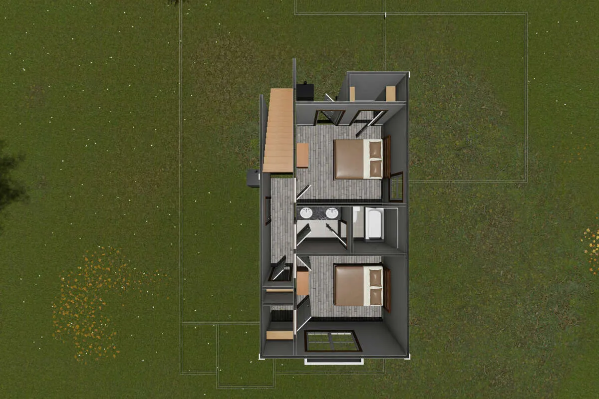 Двухэтажный проект дома позволяет рационально распорядиться площадью участка небольшого размера или узкой формы. На первом этаже находятся общие комнаты (гостиная/столовая, кухня, подсобные и технические помещения), на втором — спальни членов семьи.