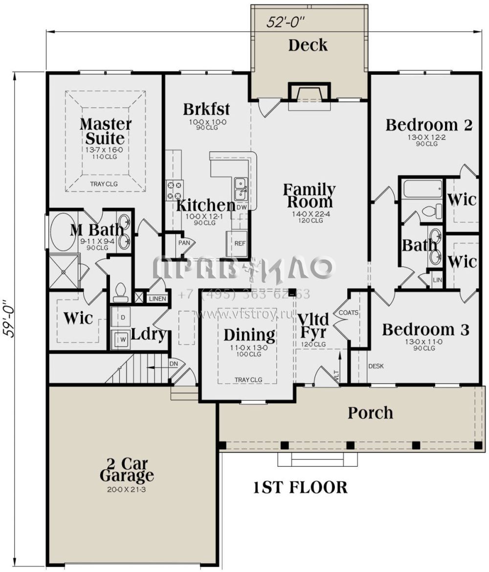 S5-174 (009-00018) Это иностранный проект, для которого требуется адаптация под нормы, действующие в Российской Федерации. Вы видите проект дома в стиле Ранчо. В этом доме сочетаются черты сельской постройки и аскетичность лофта. Внутри жильцы смогут проводить время с максимальным комфортом. Обратим внимание, что сейчас на планировках все размеры представлены в футах. Для перевода в метры вам необходимо значение в футах умножить на 0,3048.
