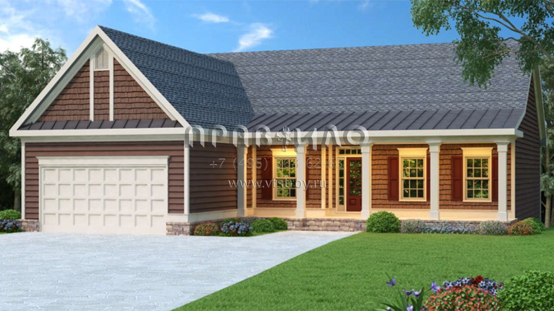 Это проект одноэтажного дома с гаражом на две машины жилой площадью 174 кв.м. Длина дома 18 м, ширина 15.8 м, высота 6.7 м. В доме три спальни и два санузла.