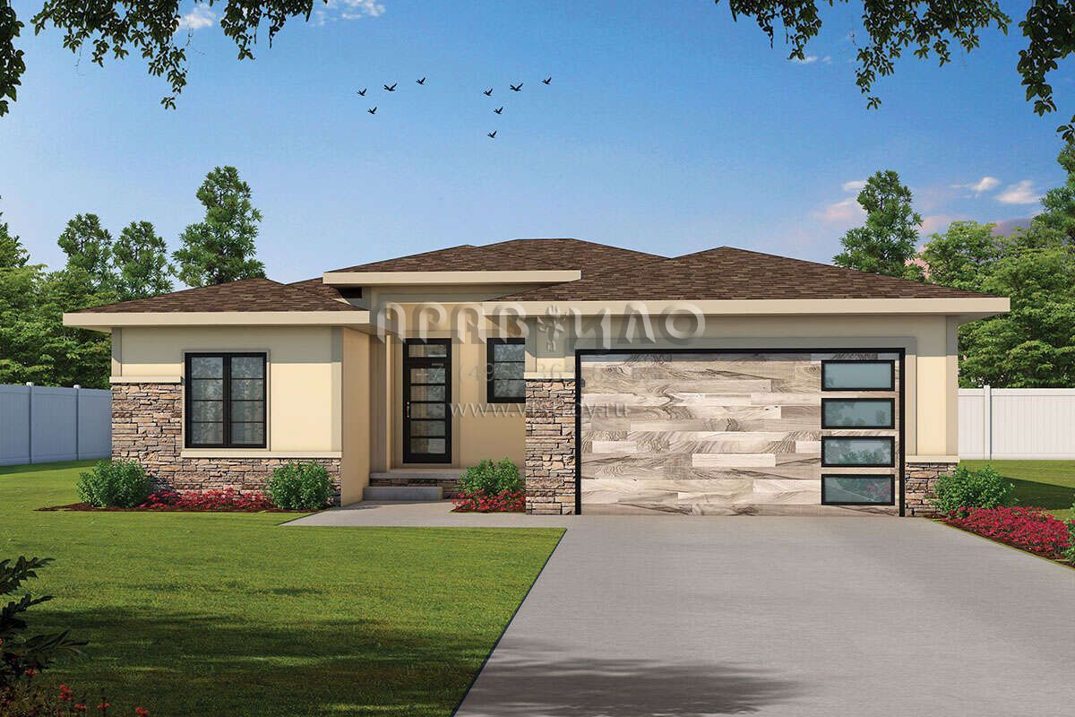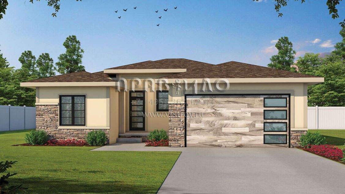 Это проект одноэтажного дома с гаражом на две машины жилой площадью 174 кв.м. Длина дома 19.8 м, ширина 13.7 м, высота 5.5 м. В доме три спальни и три санузла.