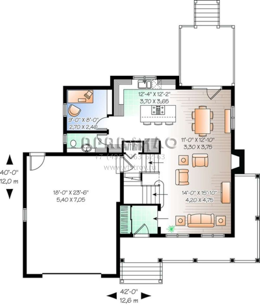 S5-175 (034-00752) Это иностранный проект, для которого требуется адаптация под нормы, действующие в Российской Федерации. Вы видите проект дома в стиле Ранчо. В этом доме сочетаются черты сельской постройки и аскетичность лофта. Внутри жильцы смогут проводить время с максимальным комфортом. Обратим внимание, что сейчас на планировках все размеры представлены в футах. Для перевода в метры вам необходимо значение в футах умножить на 0,3048.