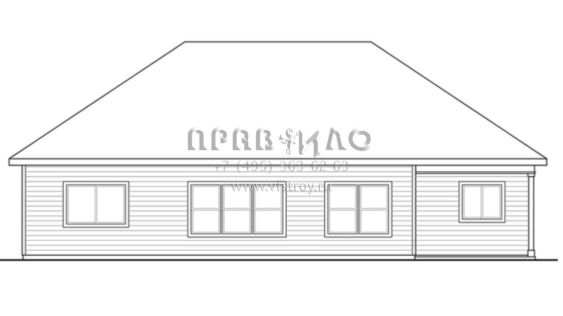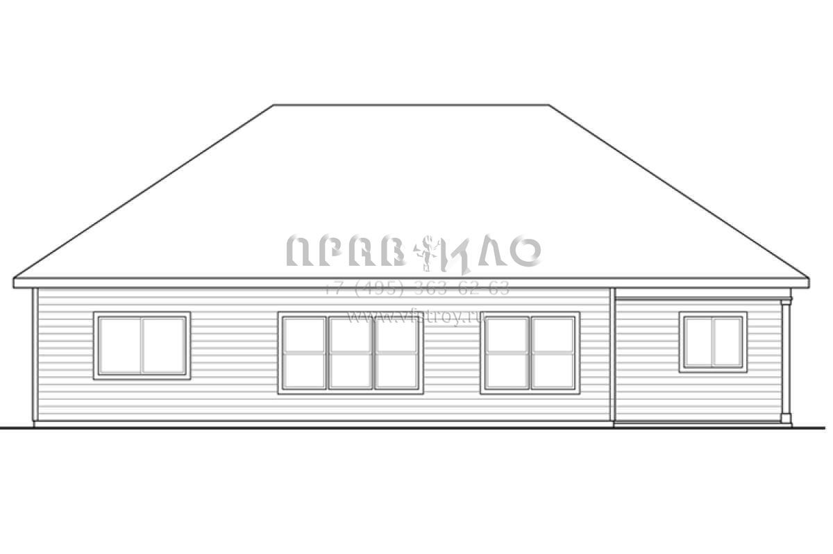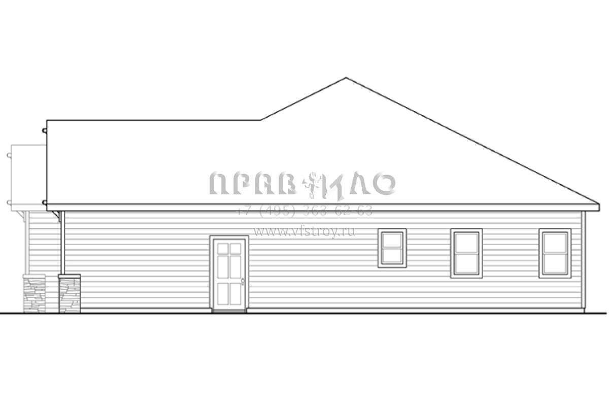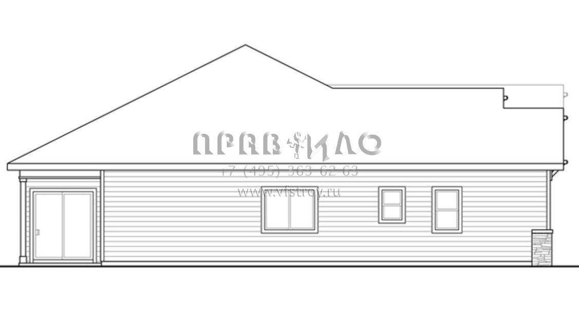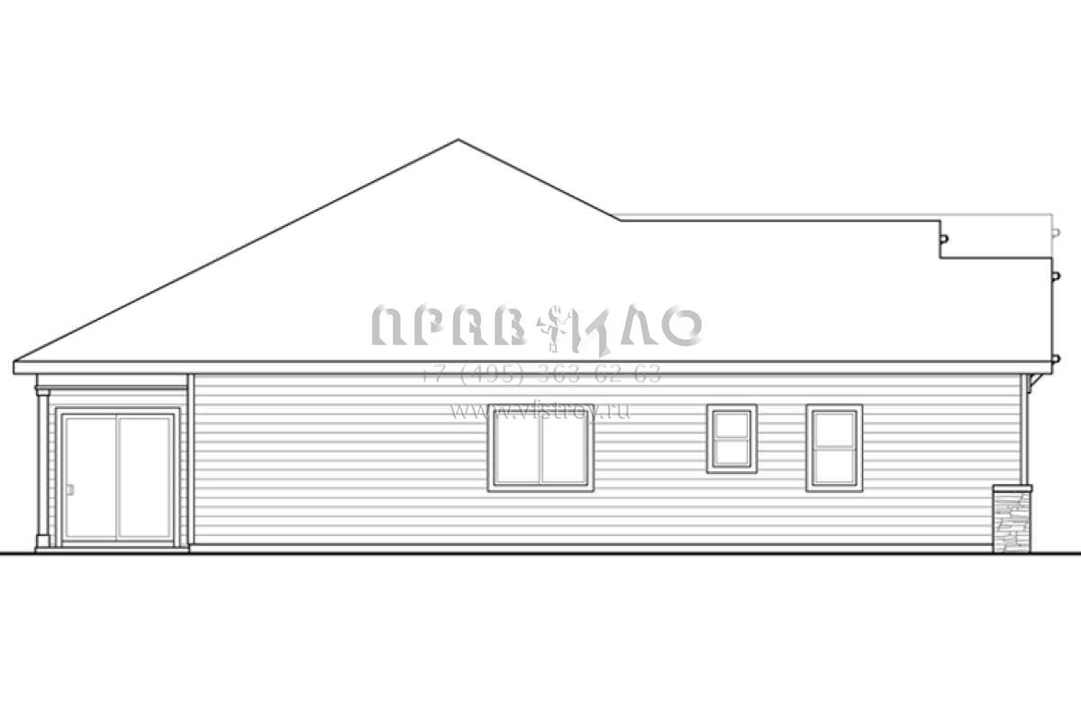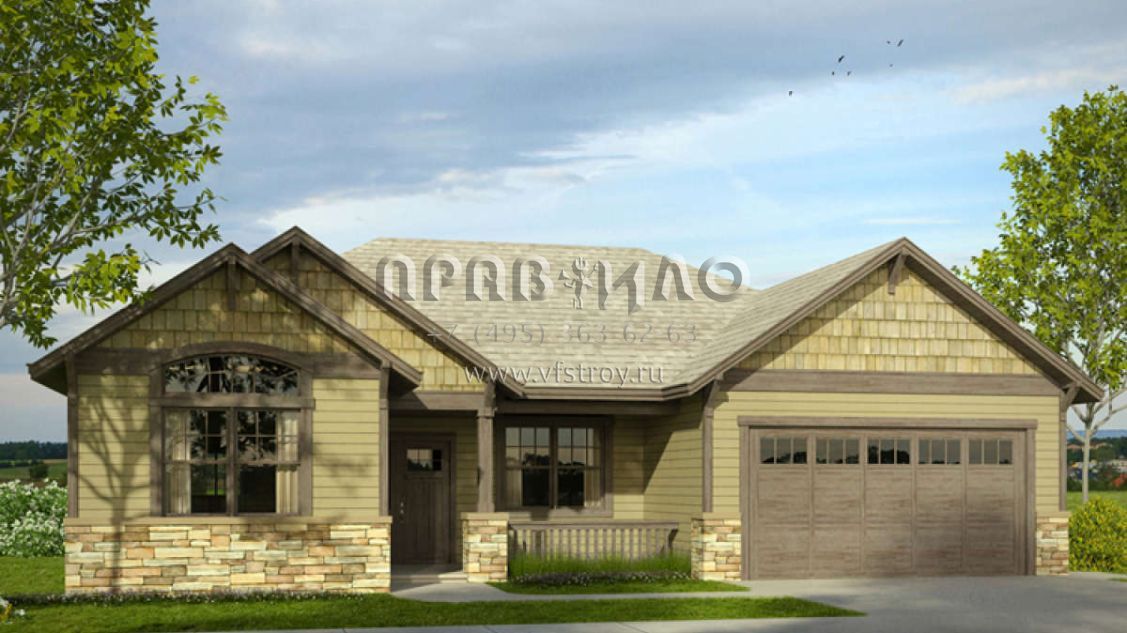 Это проект одноэтажного дома с гаражом на две машины жилой площадью 175 кв.м. Длина дома 16.2 м, ширина 15.8 м, высота 6.7 м. В доме три спальни и два санузла.