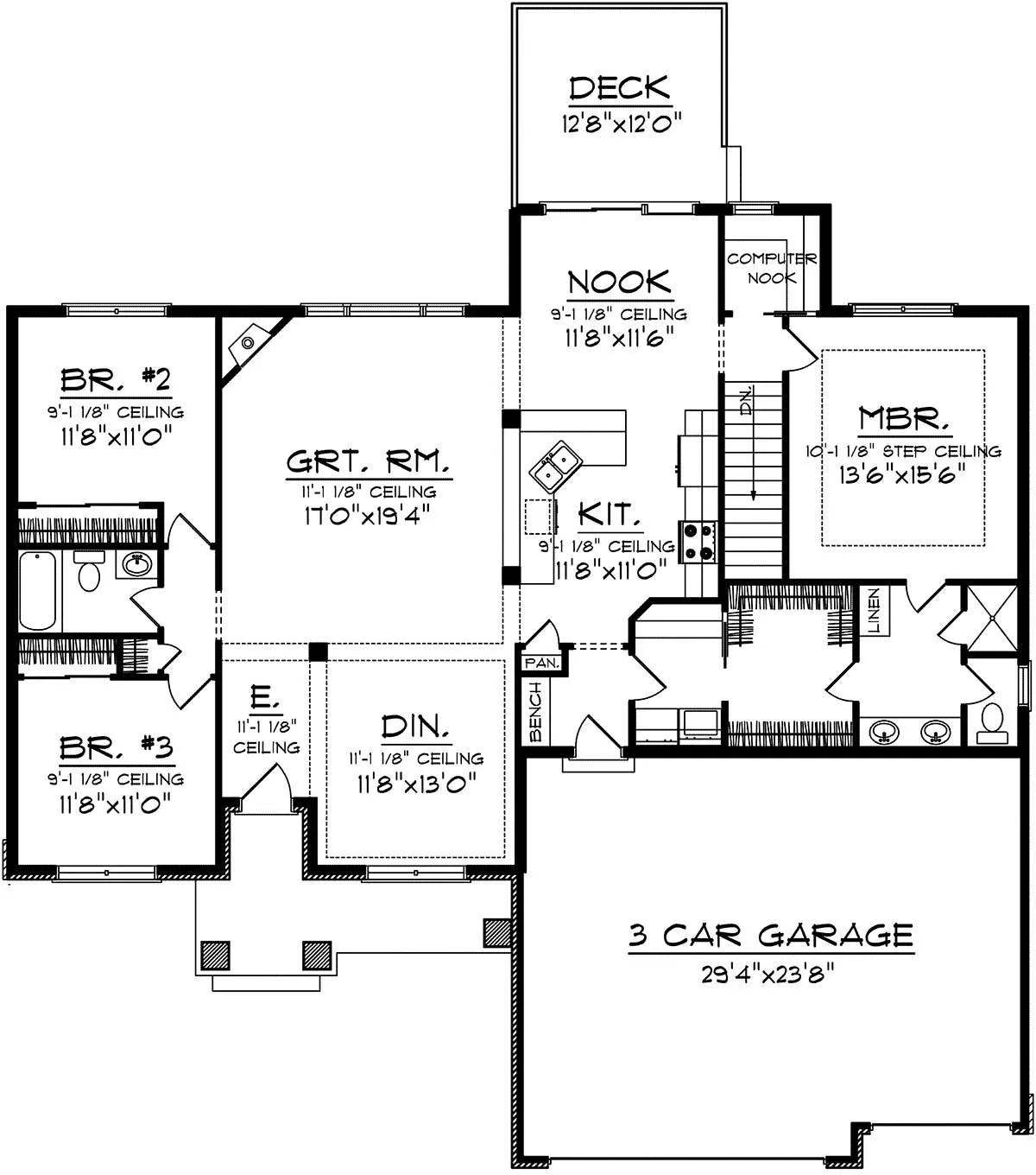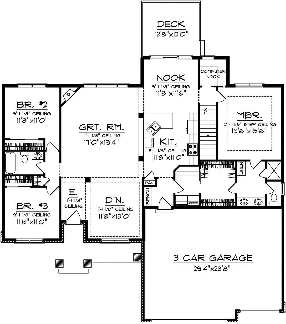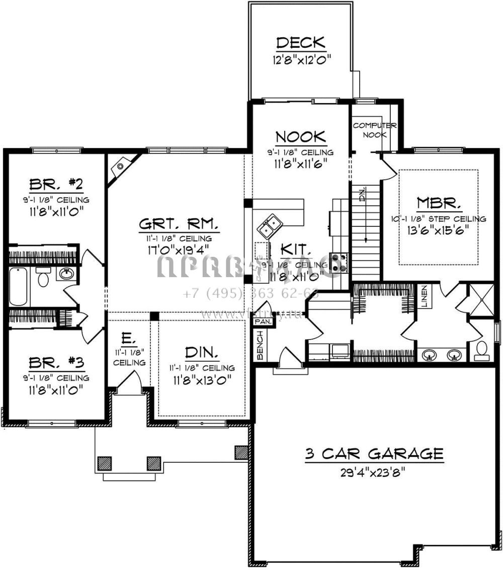 Это проект одноэтажного дома с гаражом на три и более машин жилой площадью 175 кв.м. Длина дома 17.1 м, ширина 18.3 м, высота 6.7 м. В доме три спальни и два санузла.