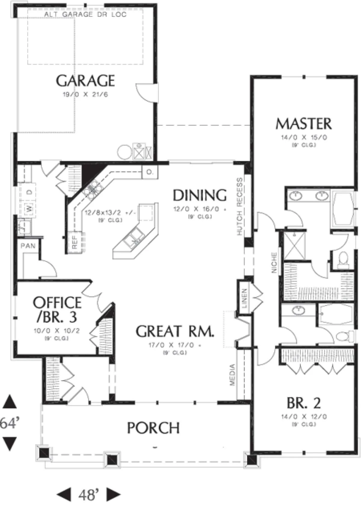Это проект одноэтажного дома с гаражом на две машины жилой площадью 176 кв.м. Длина дома 19.5 м, ширина 14.6 м, высота 6.1 м. В доме три спальни и два санузла.