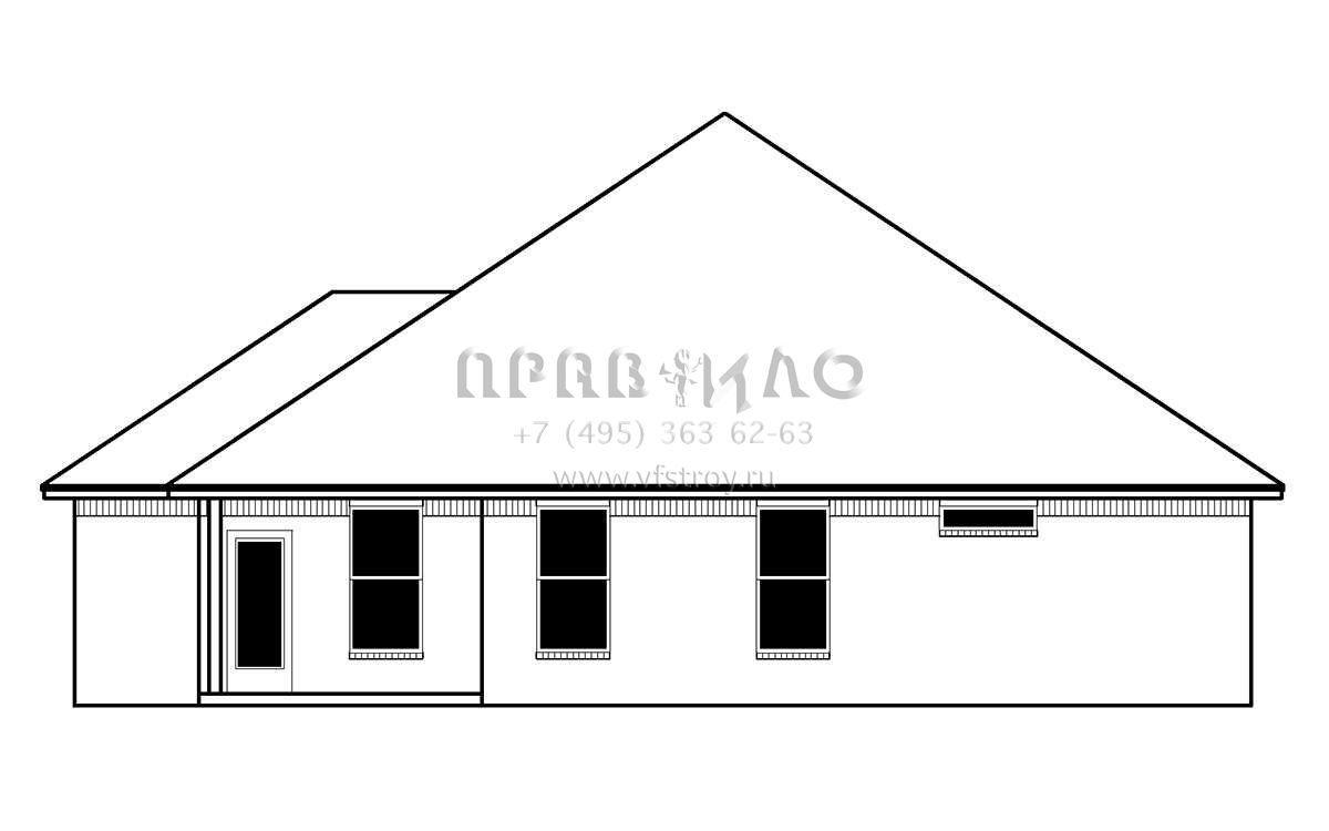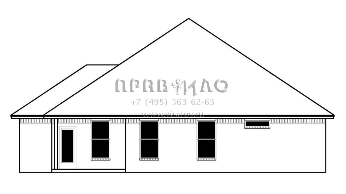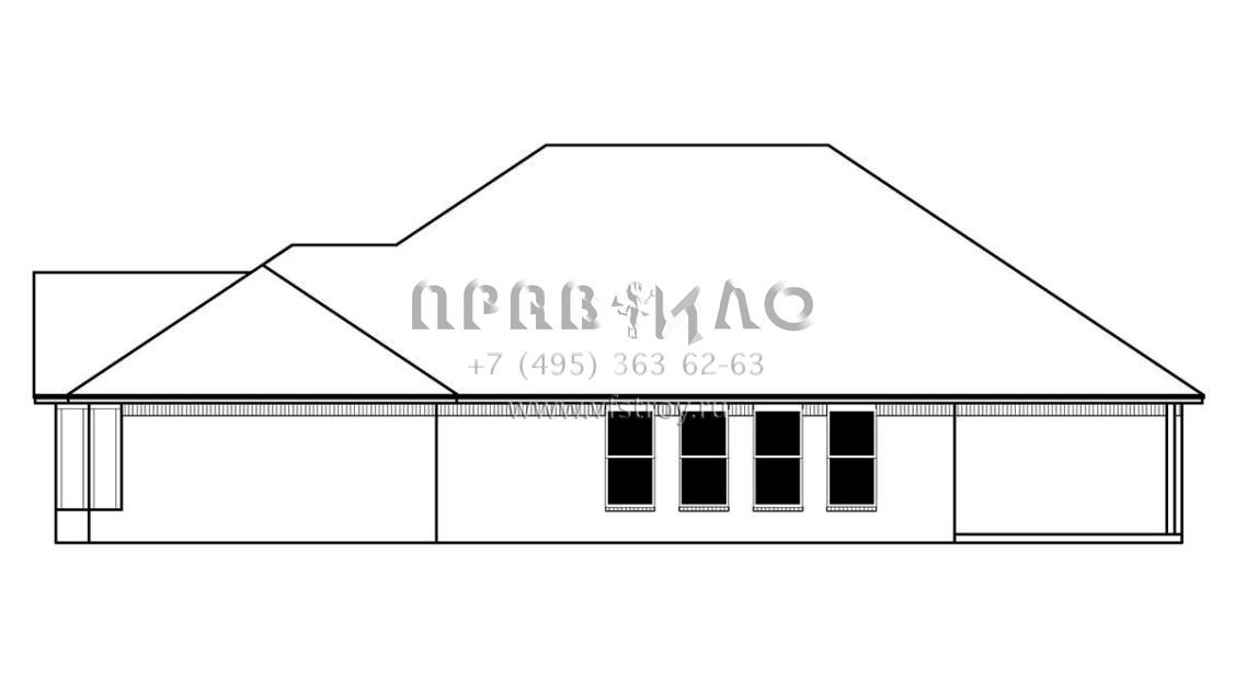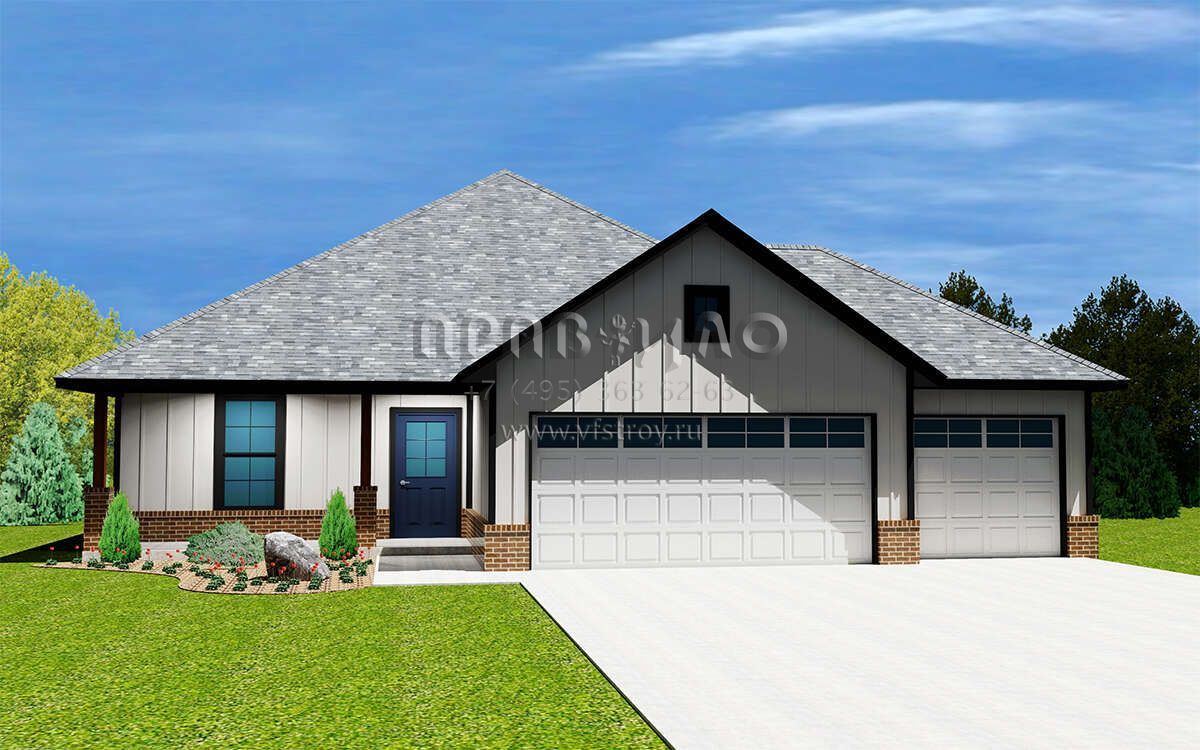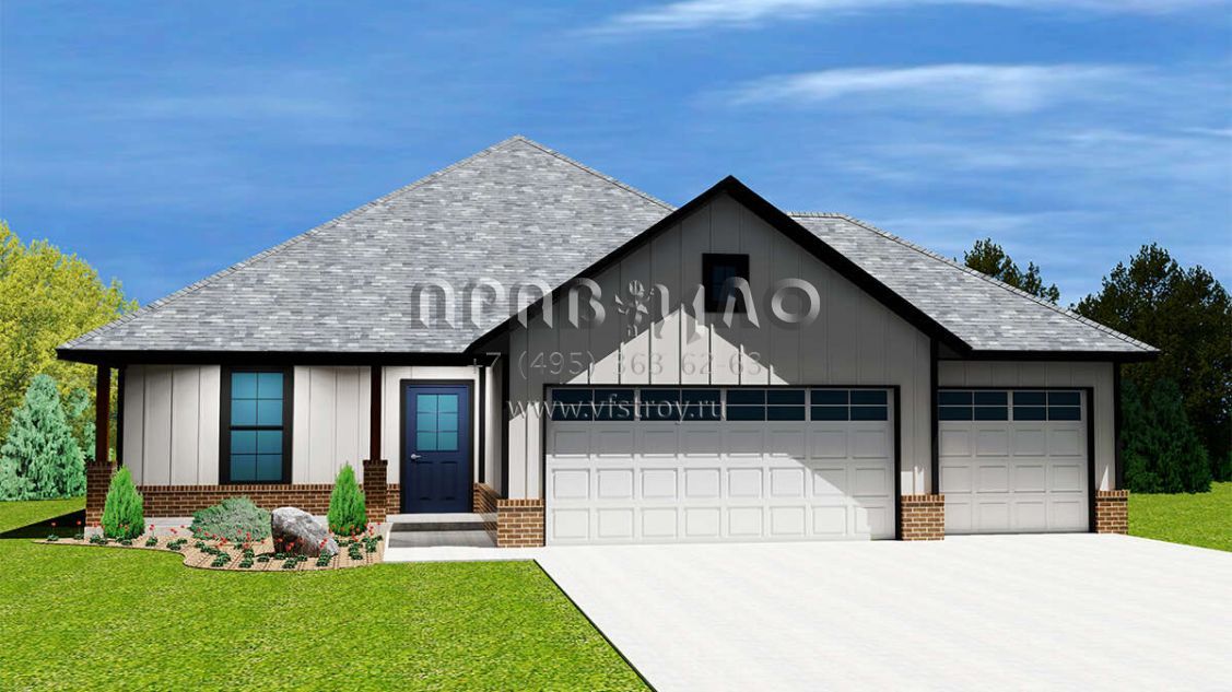 Это проект одноэтажного дома с гаражом на три и более машин жилой площадью 176 кв.м. Длина дома 20.7 м, ширина 14.6 м, высота 7.3 м. В доме три спальни и два санузла.