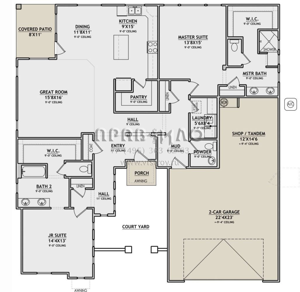 Поскольку этот проект разрабатывался иностранными архитекторами, для строительства дома требуется переработка проекта под действующие в России нормы. Данные визуализации проекта представлены для ознакомления с концепцией проекта. Проект разработан американским архитектурным бюро и представлен America's Best House Plans.