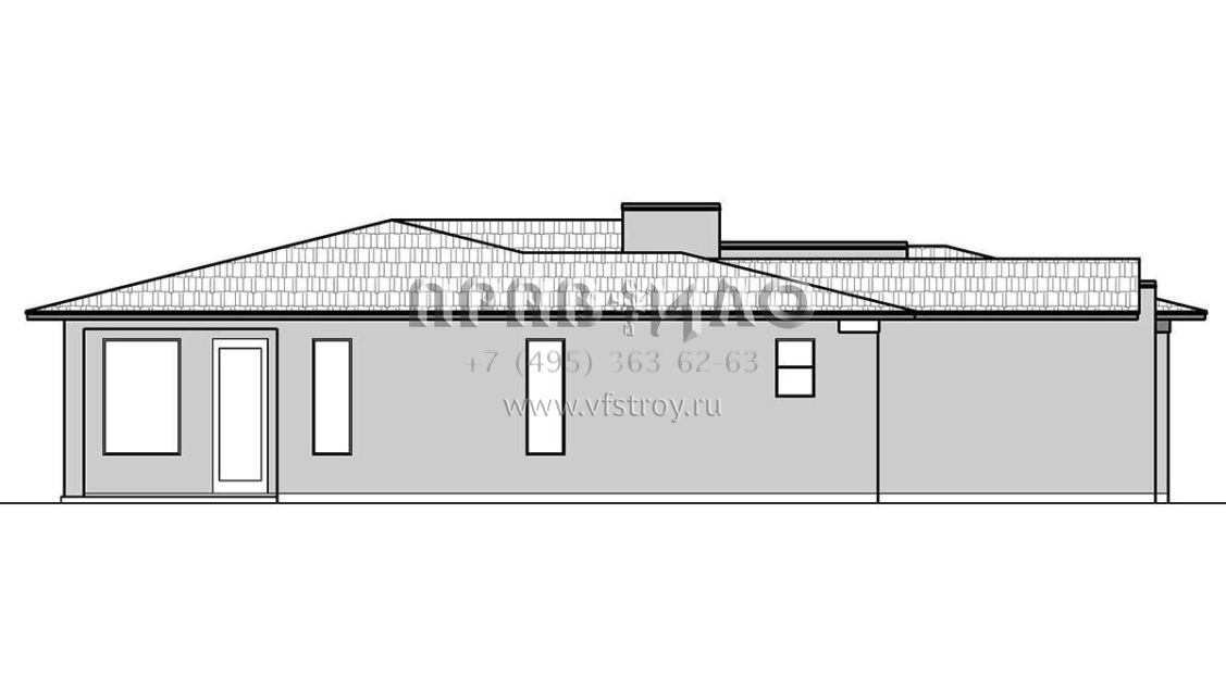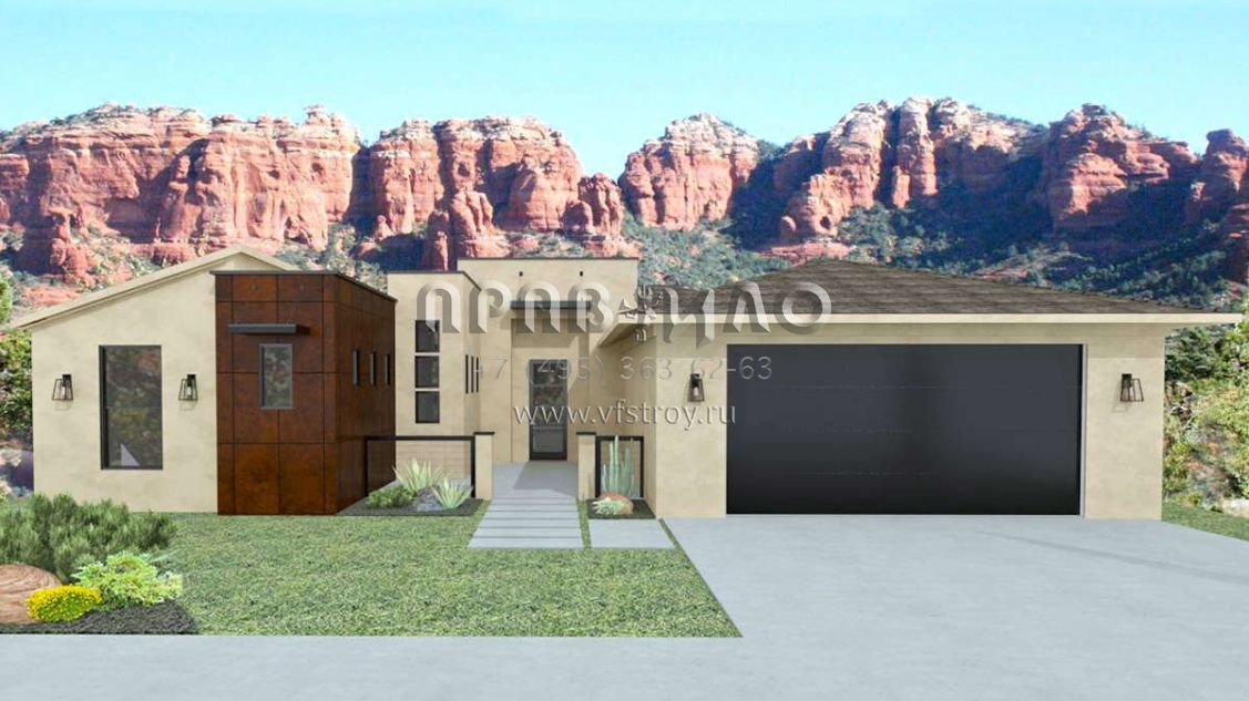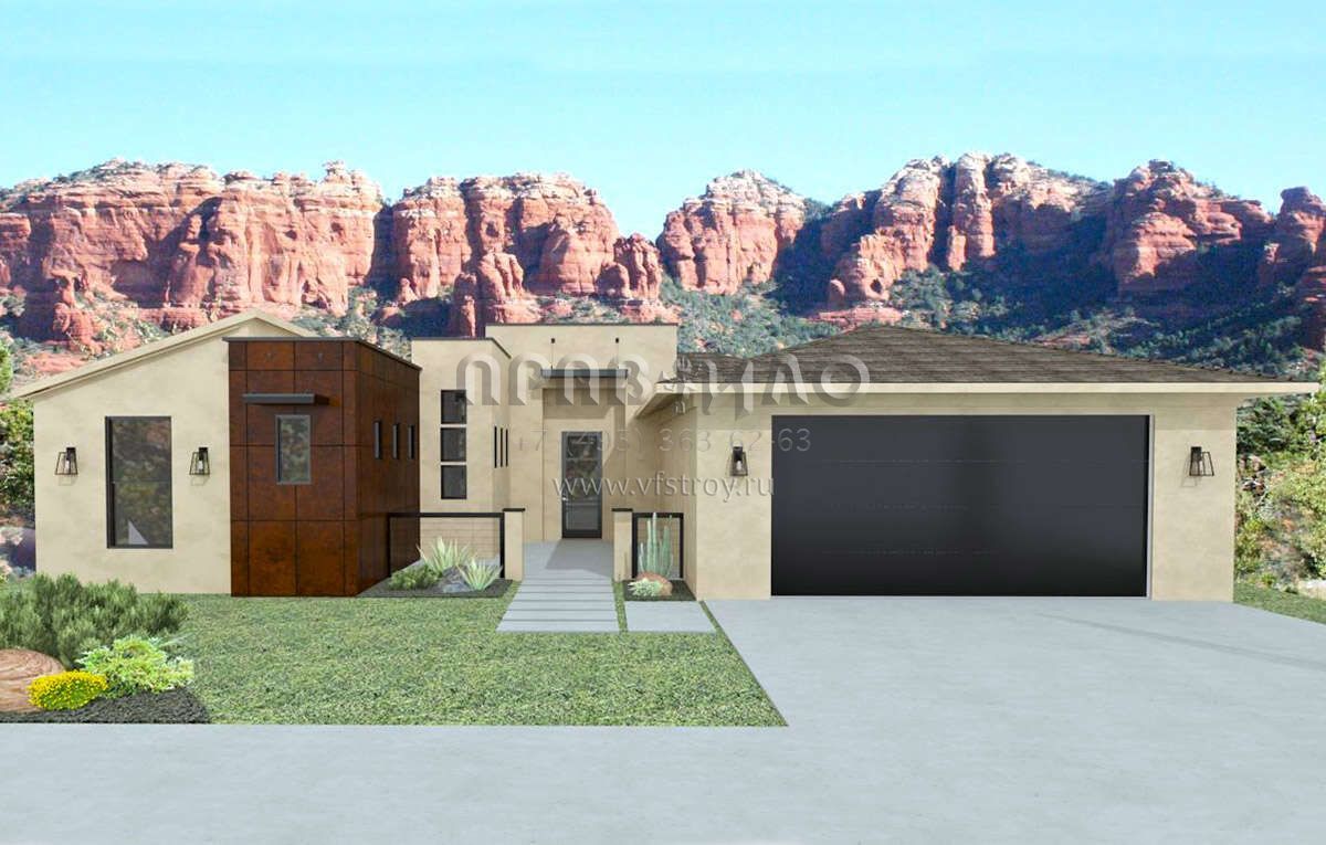 Это проект одноэтажного дома с гаражом на две машины жилой площадью 178 кв.м. Длина дома 17.4 м, ширина 16.5 м, высота 4.9 м. В доме две спальни и два санузла.