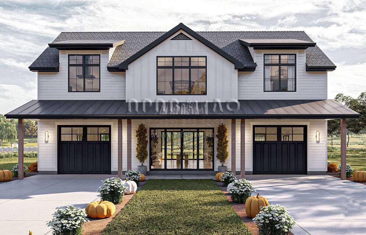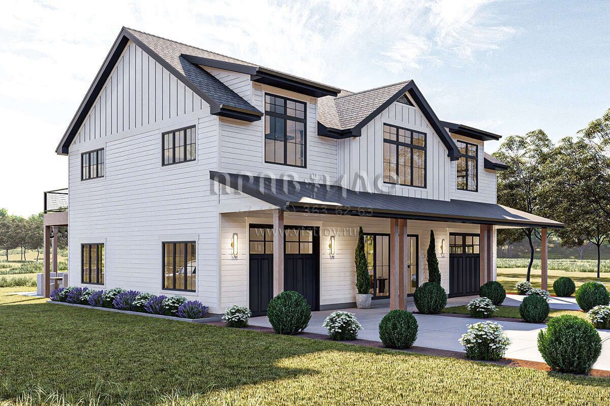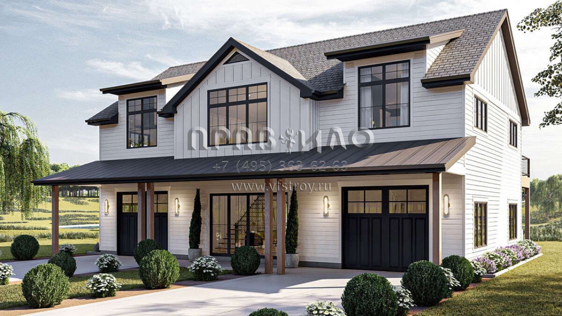 Это проект двухэтажного дома с гаражом на две машины жилой площадью 178 кв.м. Длина дома 14.3 м, ширина 16.2 м, высота 9.1 м. В доме две спальни и один санузел.