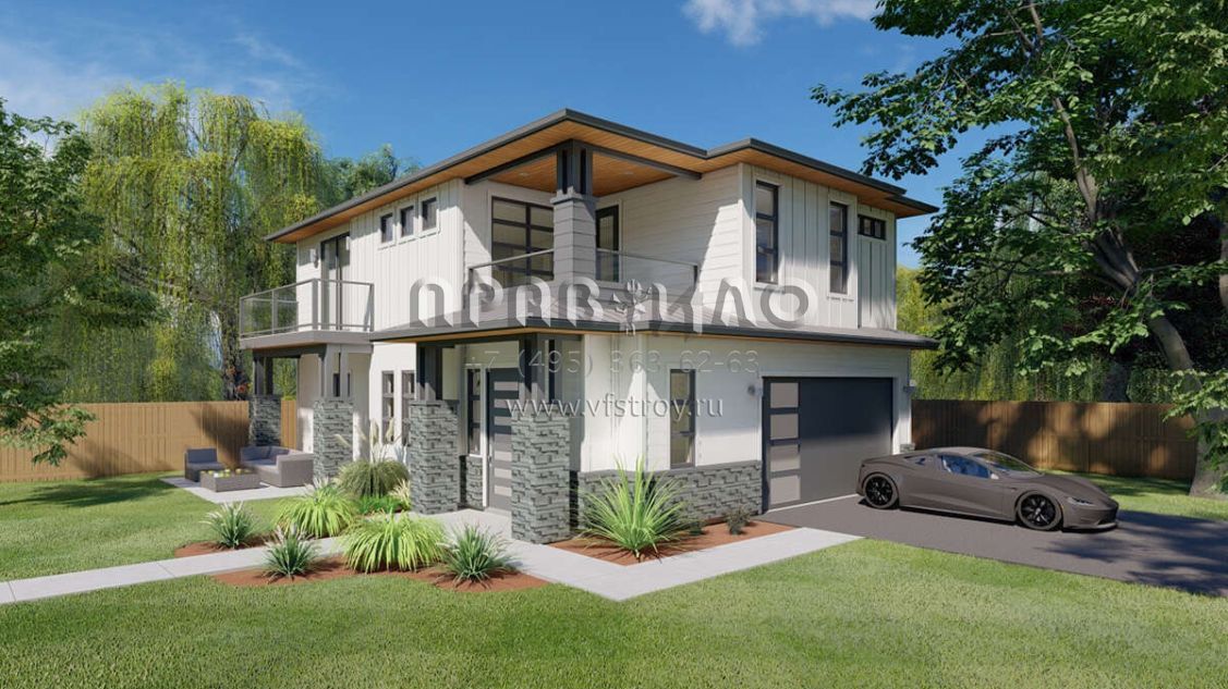 Это проект двухэтажного дома с гаражом на две машины жилой площадью 179 кв.м. Длина дома 12.5 м, ширина 10.1 м, высота 7.6 м. В доме три спальни и три санузла.