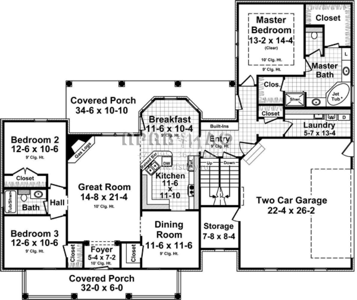S5-179 (348-00225) Это иностранный проект, для которого требуется адаптация под нормы, действующие в Российской Федерации. Вы видите проект дома в стиле Ранчо. В этом доме сочетаются черты сельской постройки и аскетичность лофта. Внутри жильцы смогут проводить время с максимальным комфортом. Обратим внимание, что сейчас на планировках все размеры представлены в футах. Для перевода в метры вам необходимо значение в футах умножить на 0,3048.