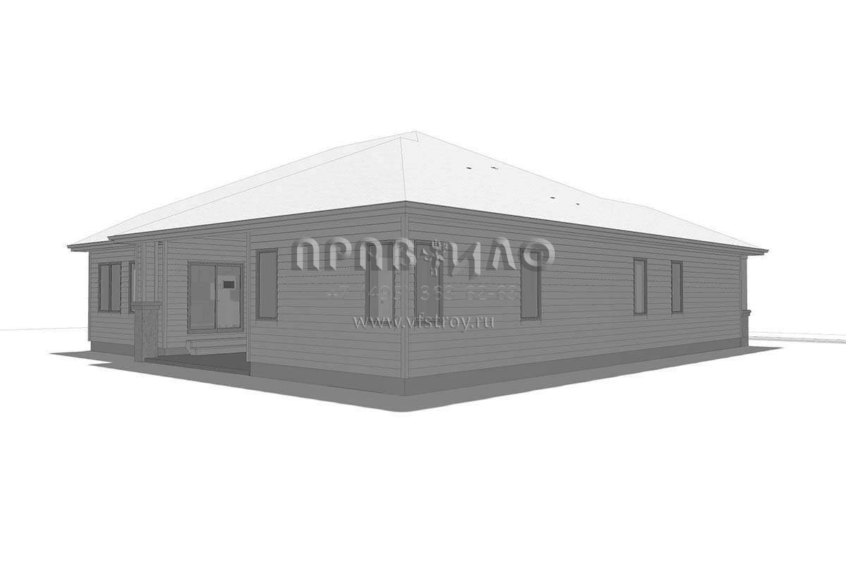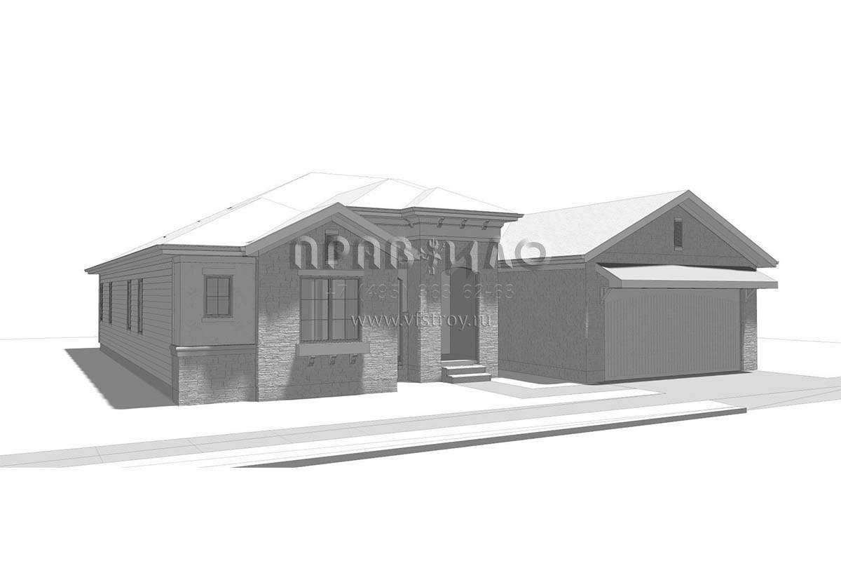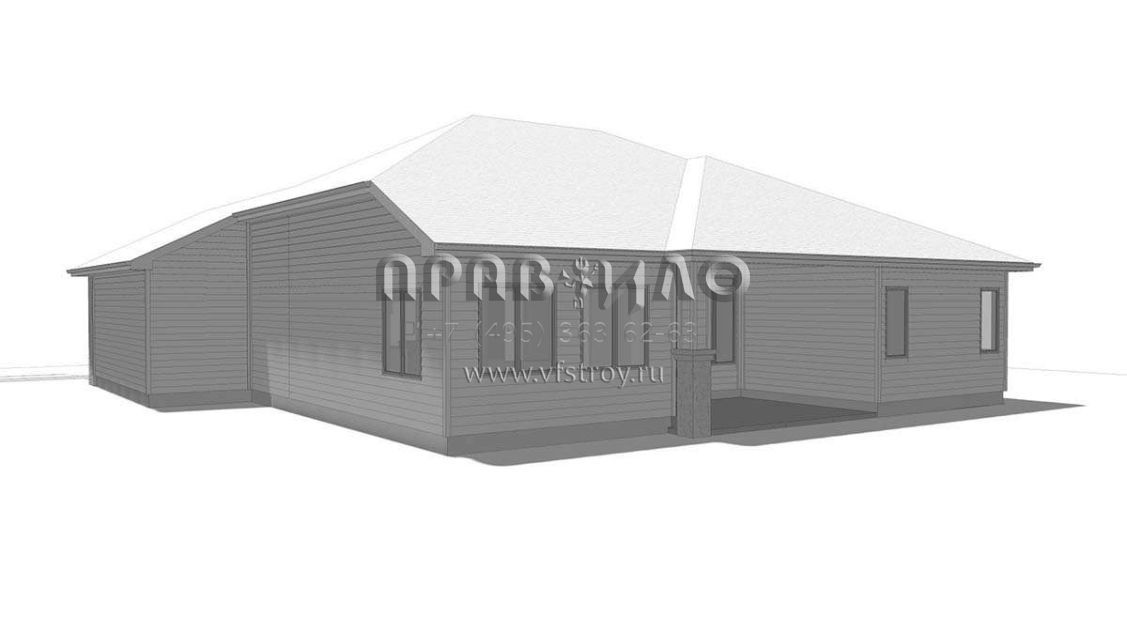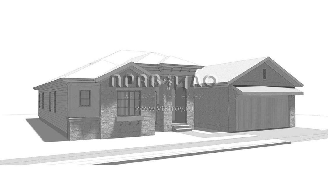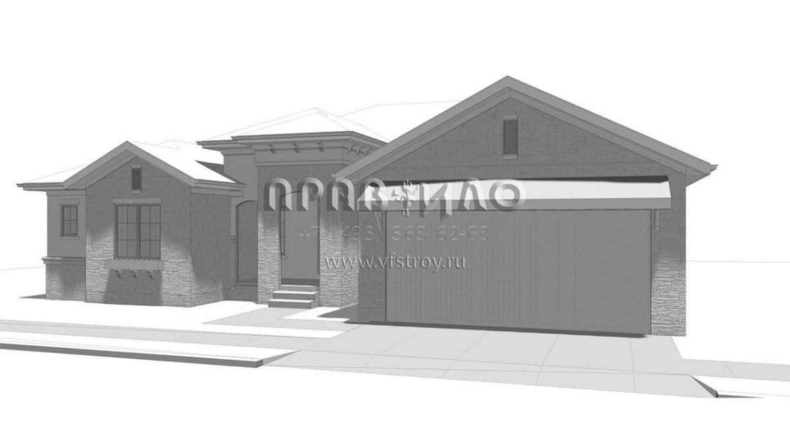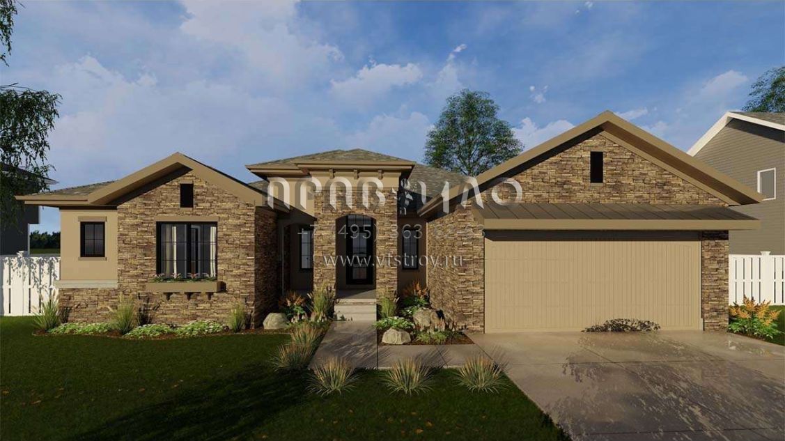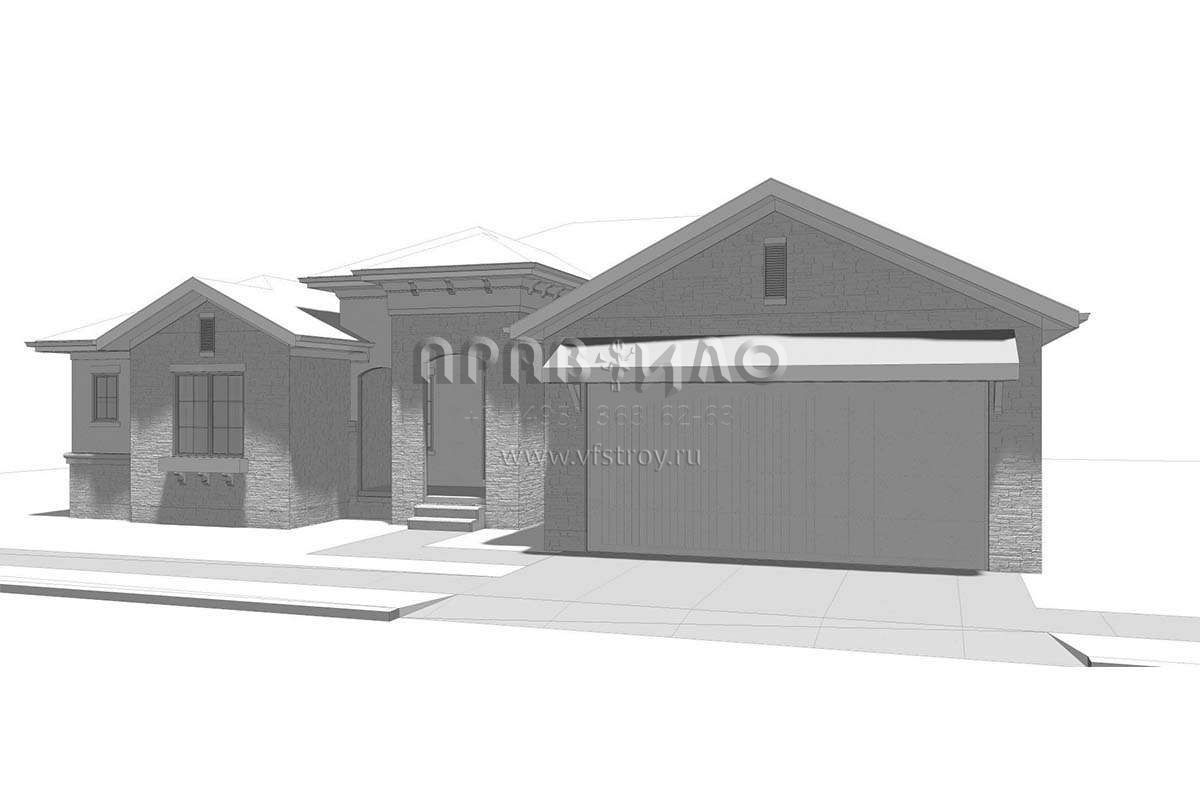 Это проект одноэтажного дома с гаражом на две машины жилой площадью 179 кв.м. Длина дома 18.3 м, ширина 16.8 м, высота 7 м. В доме три спальни и два санузла.