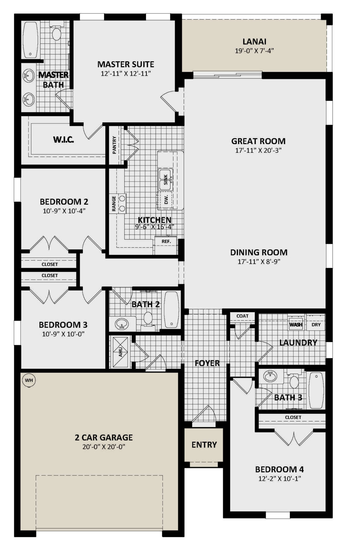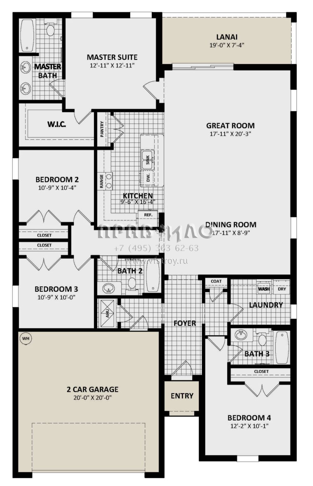 Это проект одноэтажного дома с гаражом на две машины жилой площадью 181 кв.м. Длина дома 19.8 м, ширина 12.2 м, высота 5.2 м. В доме четыре спальни и три санузла.