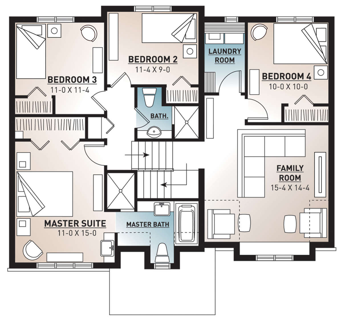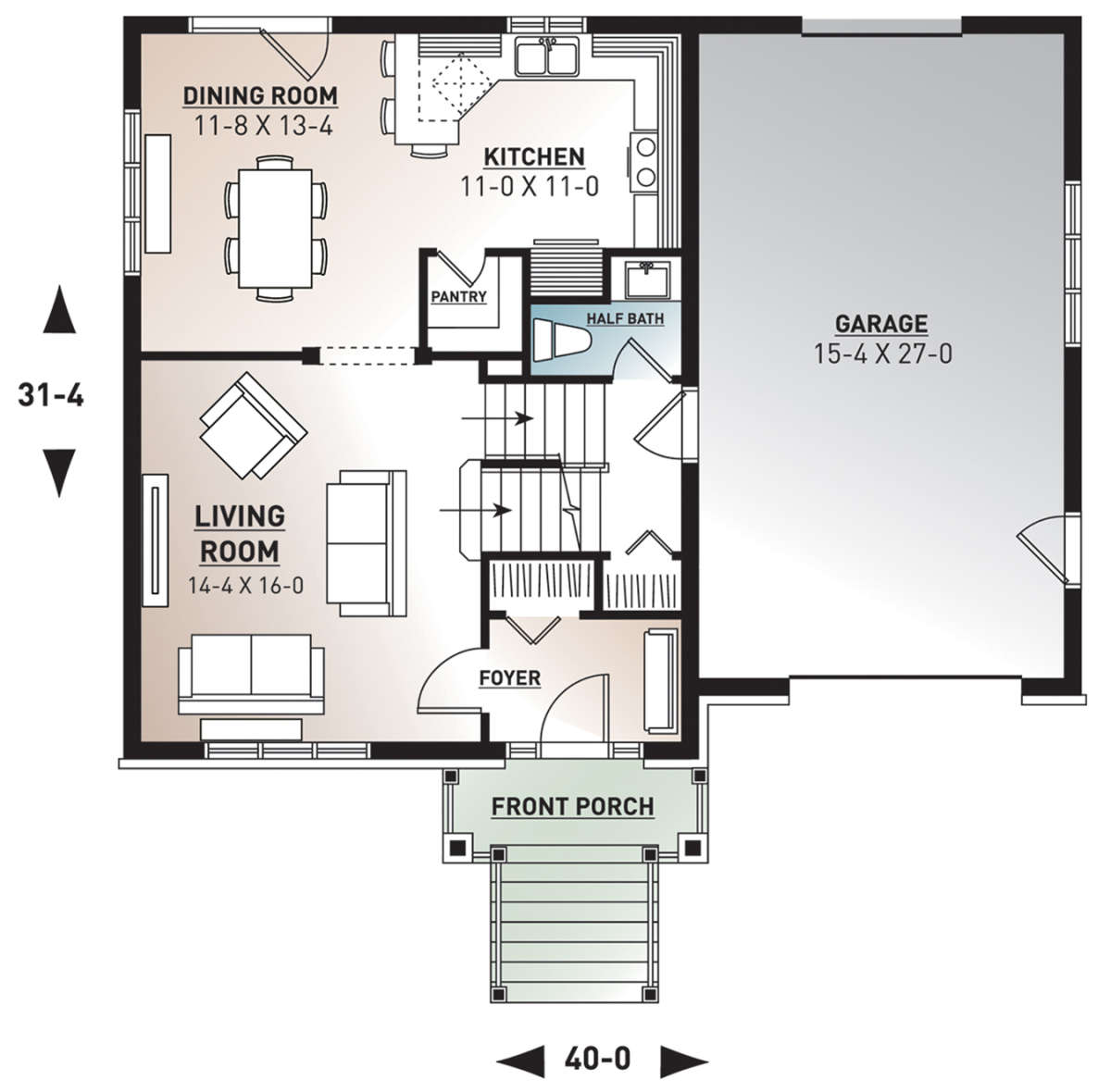 Двухэтажный проект дома позволяет рационально распорядиться площадью участка небольшого размера или узкой формы. На первом этаже находятся общие комнаты (гостиная/столовая, кухня, подсобные и технические помещения), на втором — спальни членов семьи.