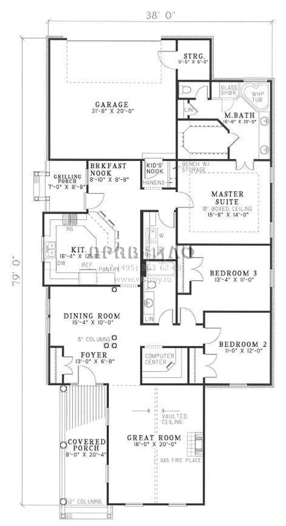 S5-183 (110-00248) Это иностранный проект, для которого требуется адаптация под нормы, действующие в Российской Федерации. Вы видите проект дома в стиле Ранчо. В этом доме сочетаются черты сельской постройки и аскетичность лофта. Внутри жильцы смогут проводить время с максимальным комфортом. Обратим внимание, что сейчас на планировках все размеры представлены в футах. Для перевода в метры вам необходимо значение в футах умножить на 0,3048.