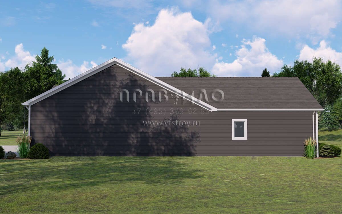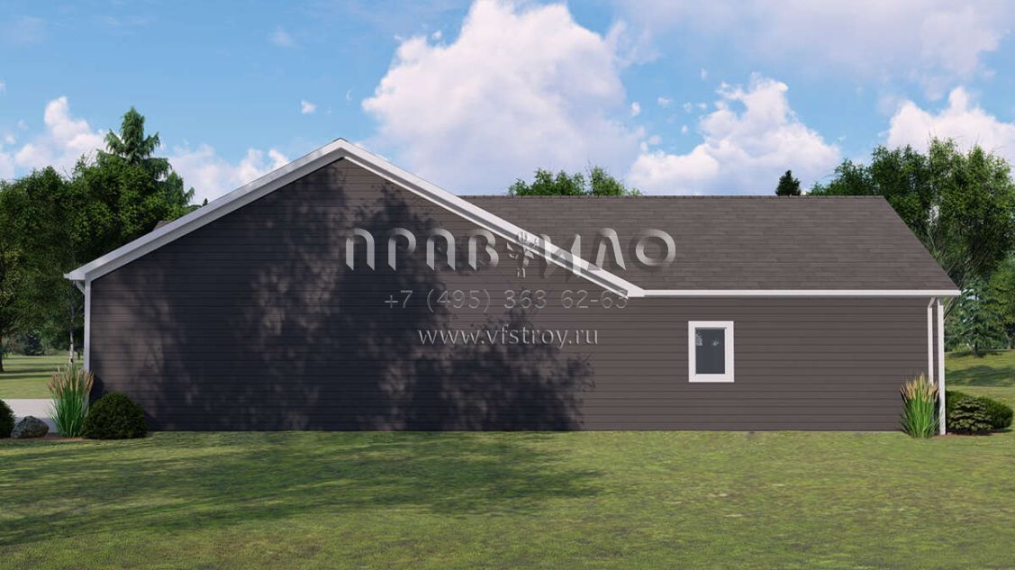 Это проект одноэтажного дома с гаражом на три и более машин жилой площадью 183 кв.м. Длина дома 18.3 м, ширина 29.6 м, высота 5.5 м. В доме три спальни и два санузла.