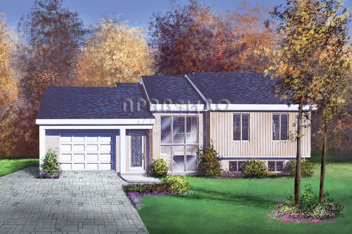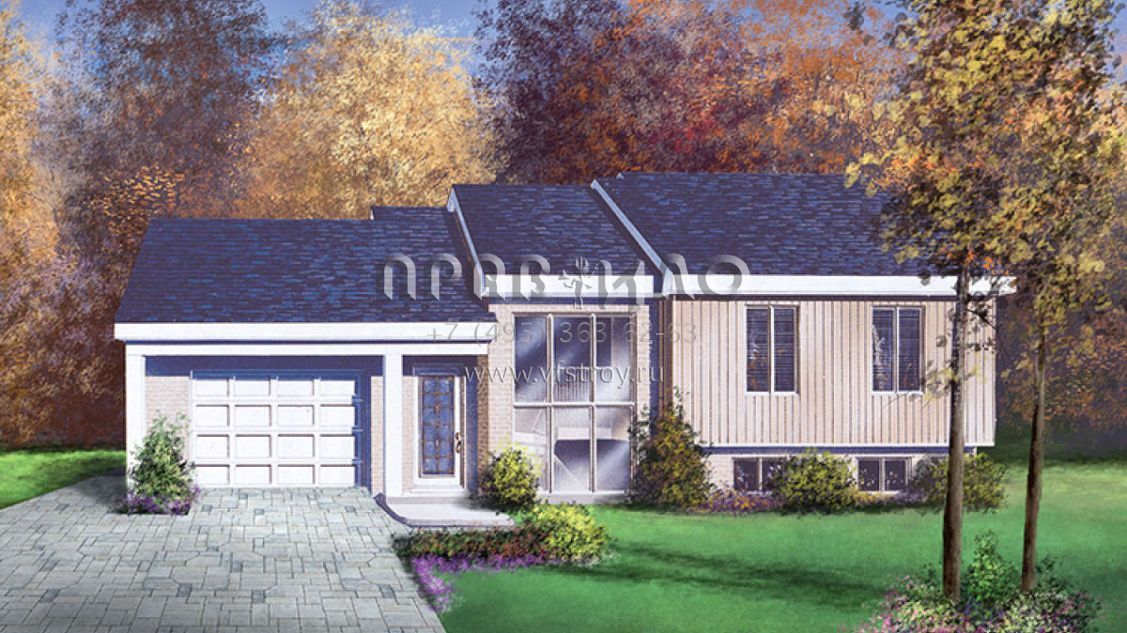 Это проект одноэтажного дома с гаражом на одну машину жилой площадью 183 кв.м. Длина дома 10.1 м, ширина 14.3 м, высота 6.4 м. В доме три спальни и один санузел.