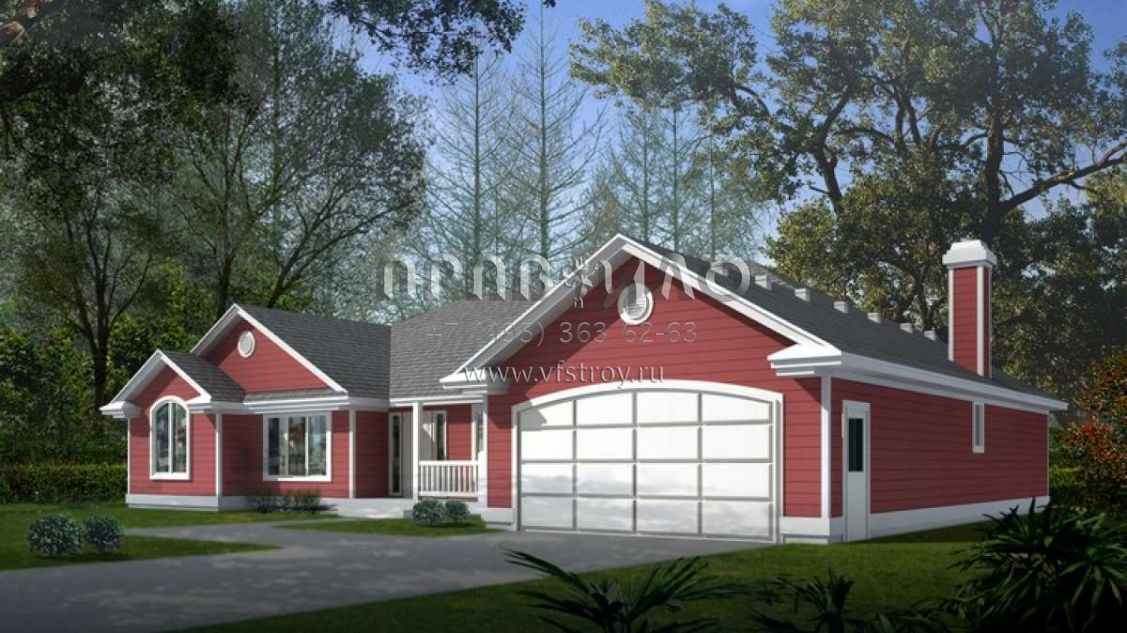 Это проект одноэтажного дома с гаражом на две машины жилой площадью 183 кв.м. Длина дома 14.3 м, ширина 19.8 м, высота 5.8 м. В доме три спальни и два санузла.