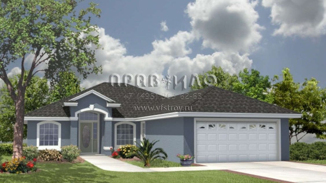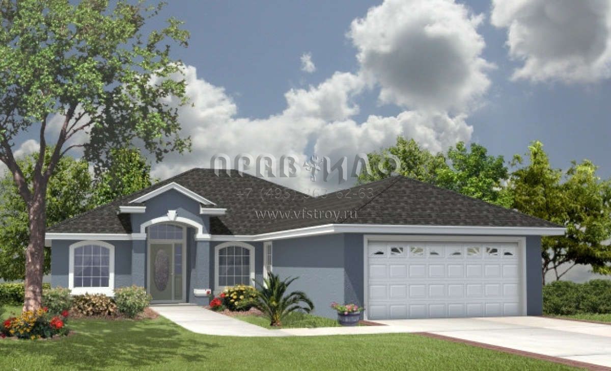 Это проект одноэтажного дома с гаражом на две машины жилой площадью 184 кв.м. Длина дома 23.5 м, ширина 13.7 м, высота 5.8 м. В доме четыре спальни и три санузла.