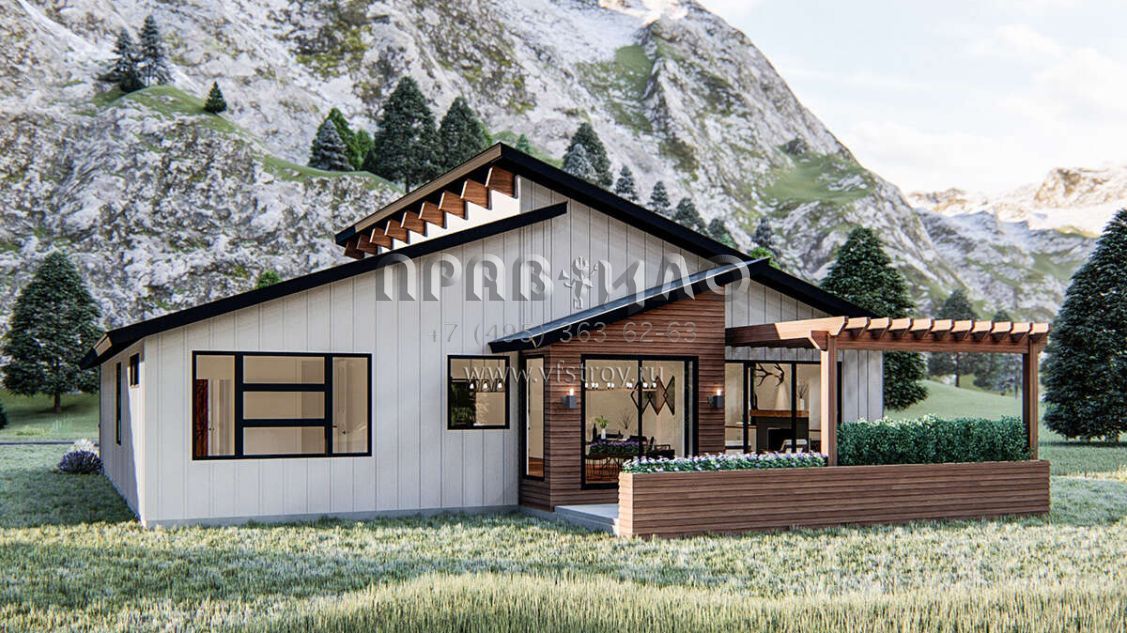 Большая площадь участка позволяет выбрать одноэтажный проект дома, особенно если в семье есть пожилые люди, инвалиды или маленькие дети.