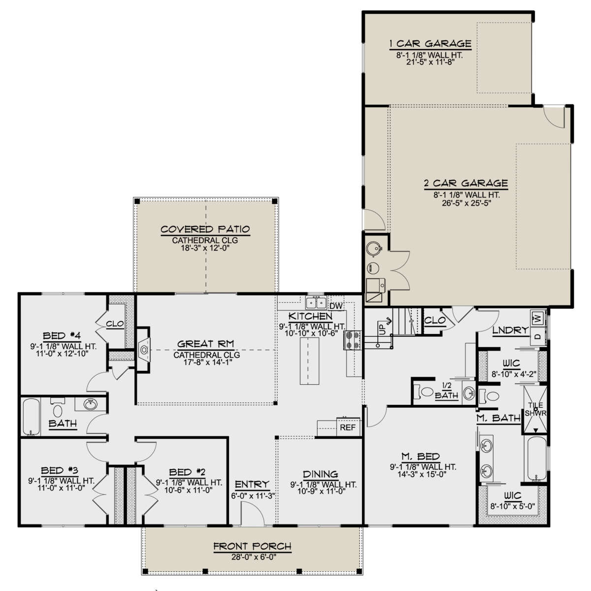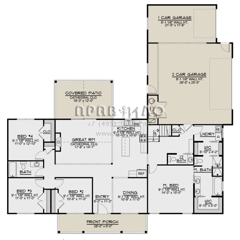 Это проект одноэтажного дома с гаражом на три и более машин жилой площадью 185 кв.м. Длина дома 21.9 м, ширина 21.6 м, высота 6.1 м. В доме четыре спальни и два санузла.