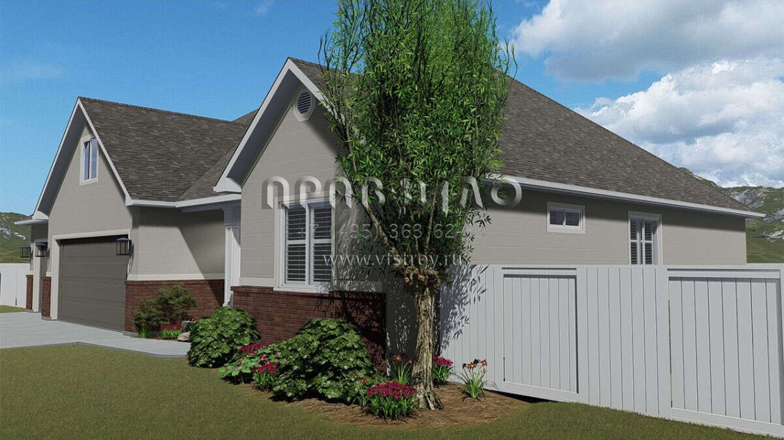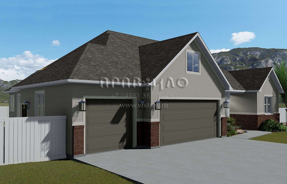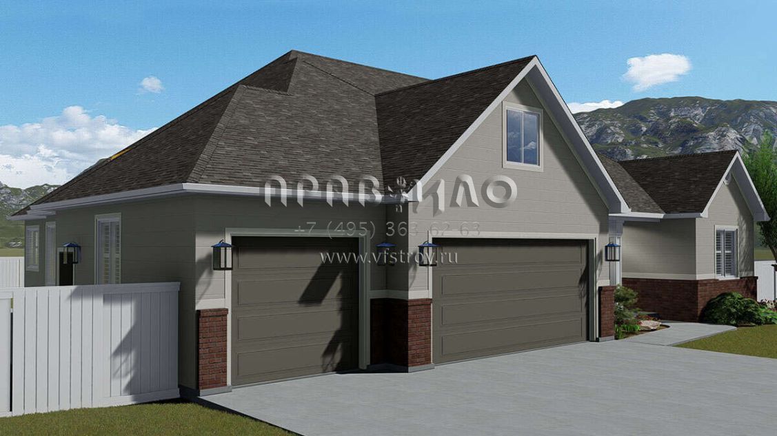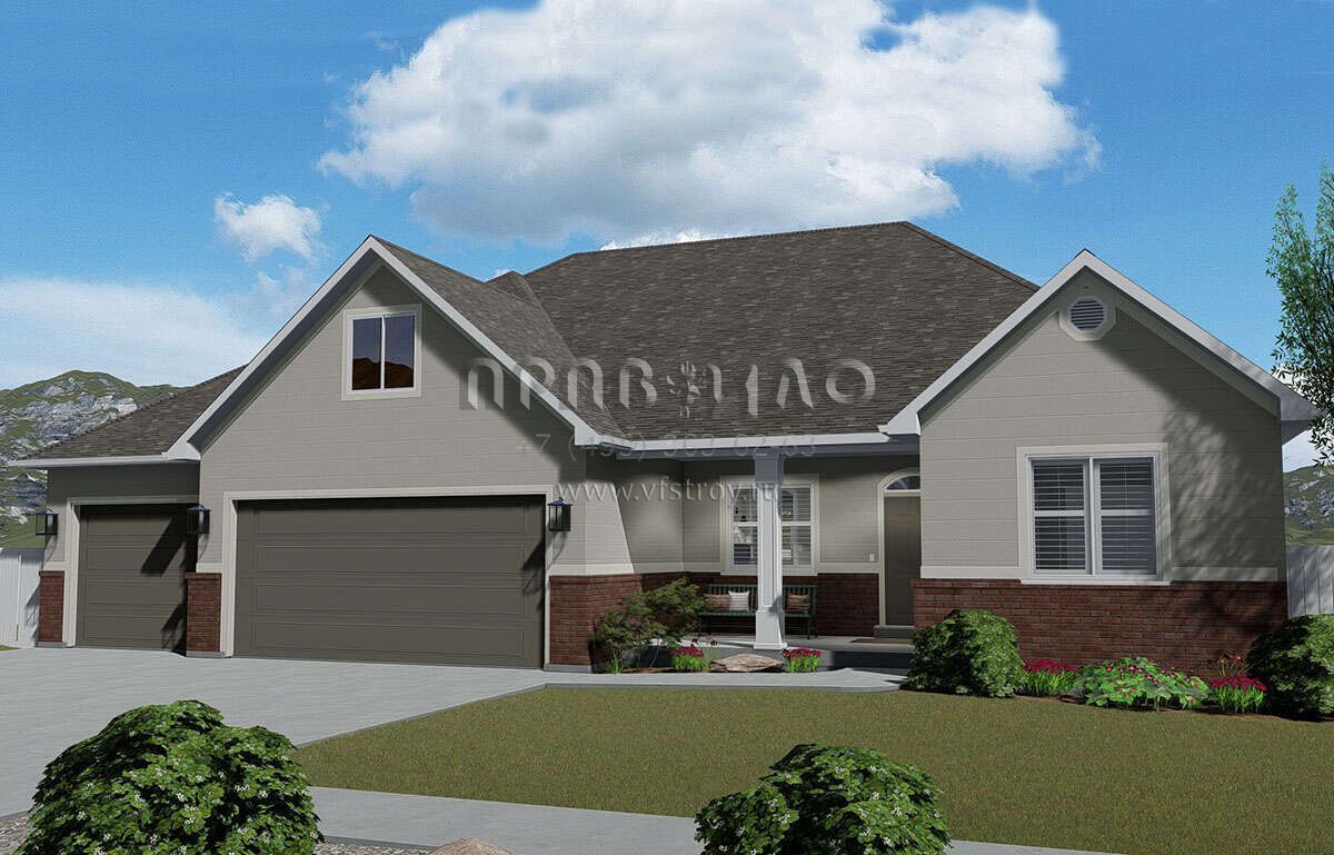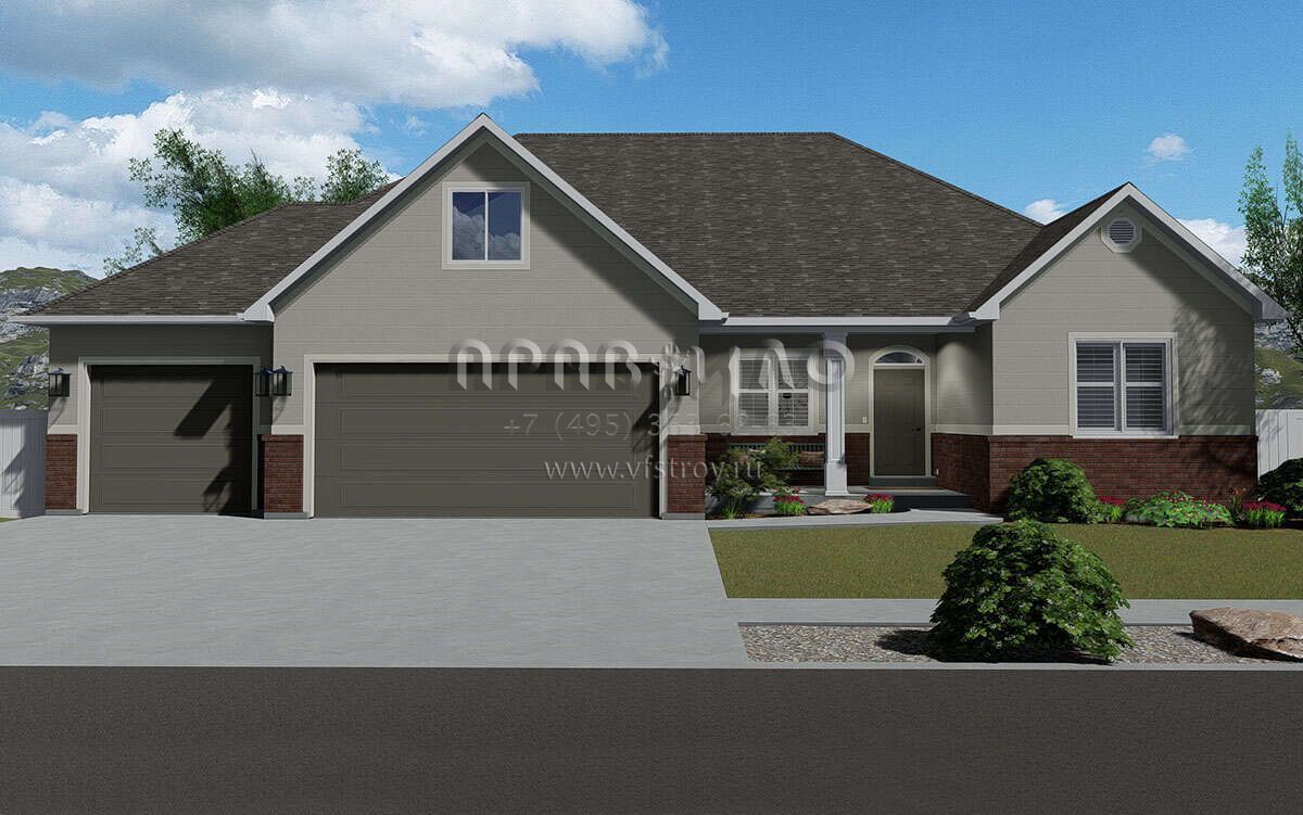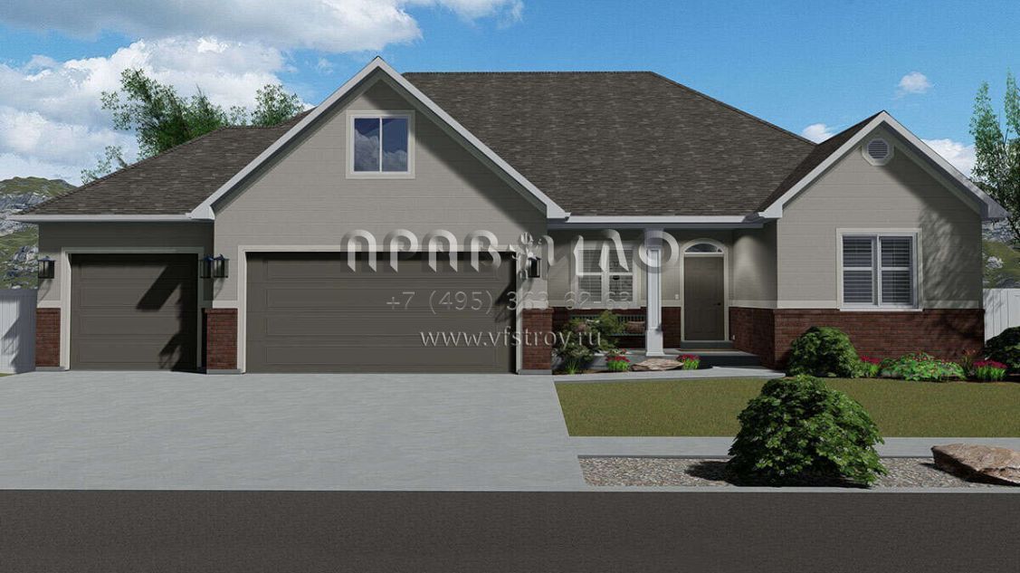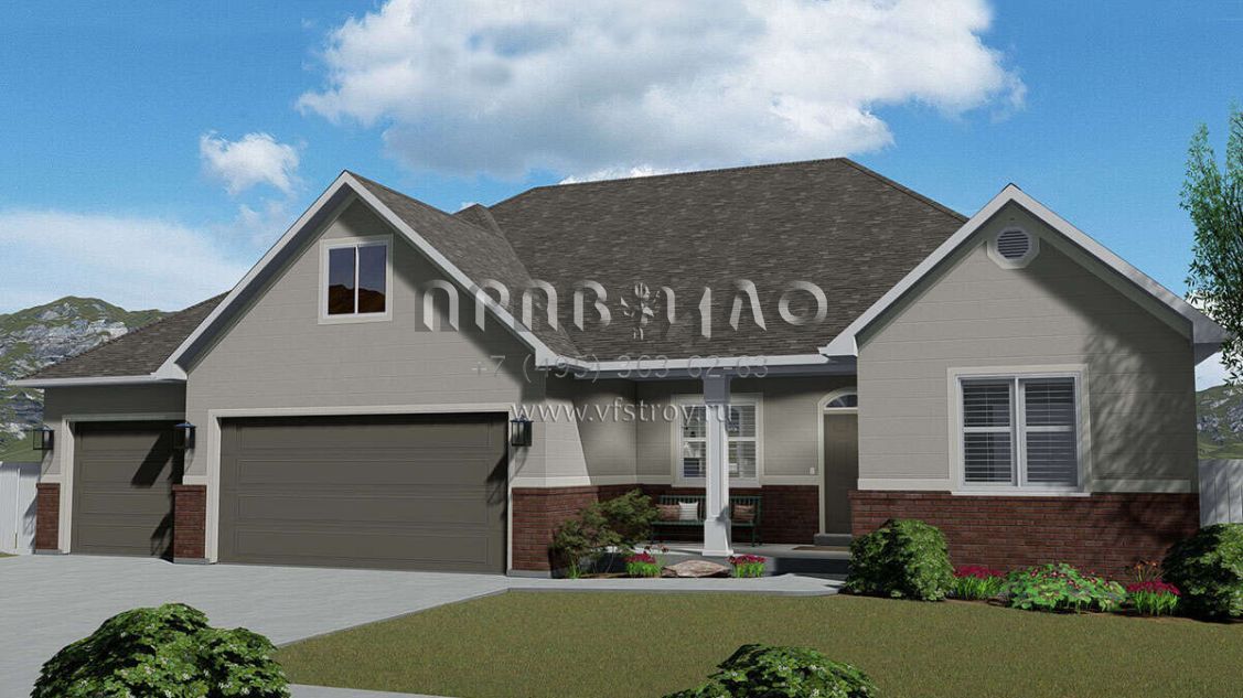 Это проект одноэтажного дома с гаражом на три и более машин жилой площадью 186 кв.м. Длина дома 15.5 м, ширина 19.2 м, высота 7.9 м. В доме три спальни и два санузла.