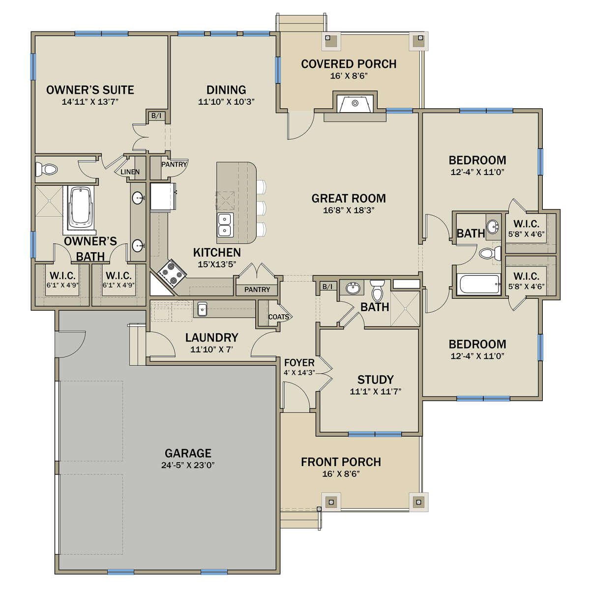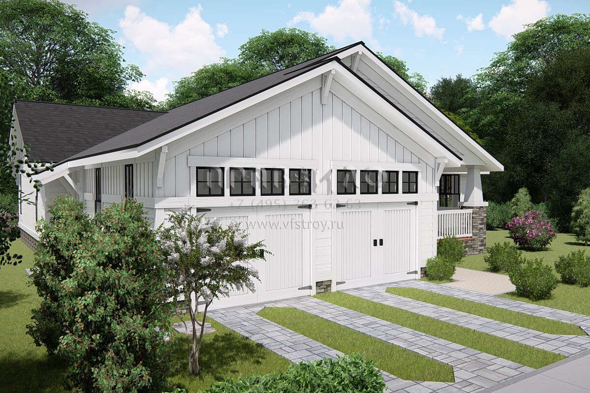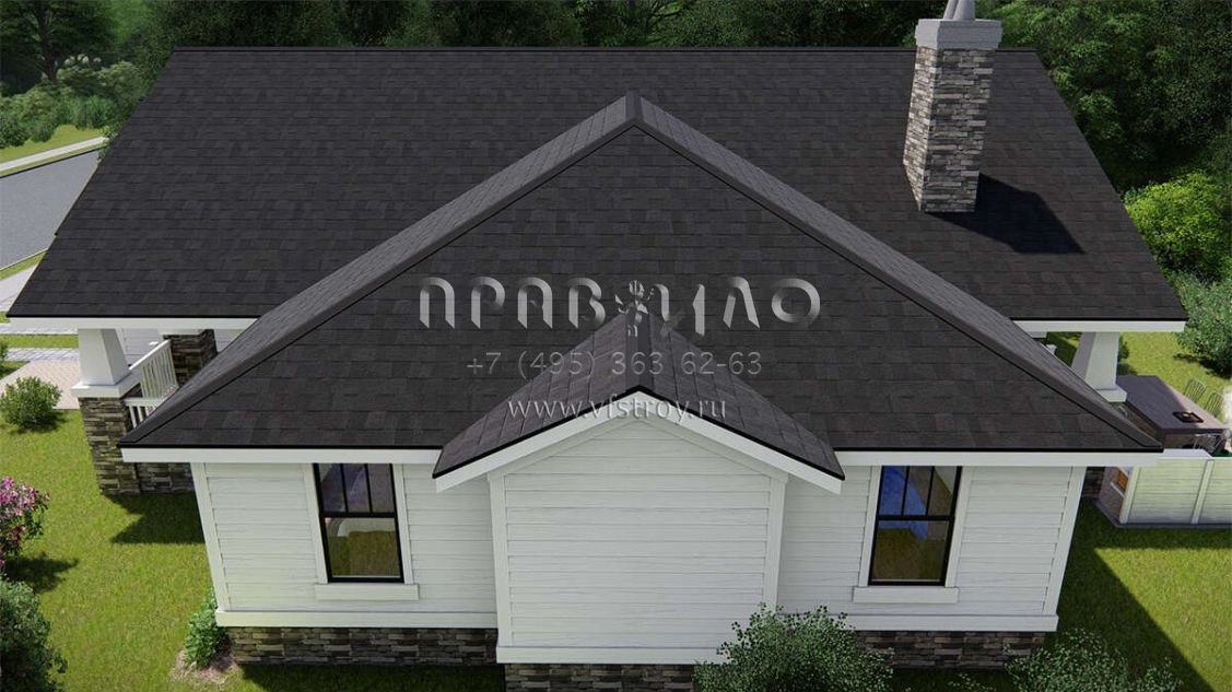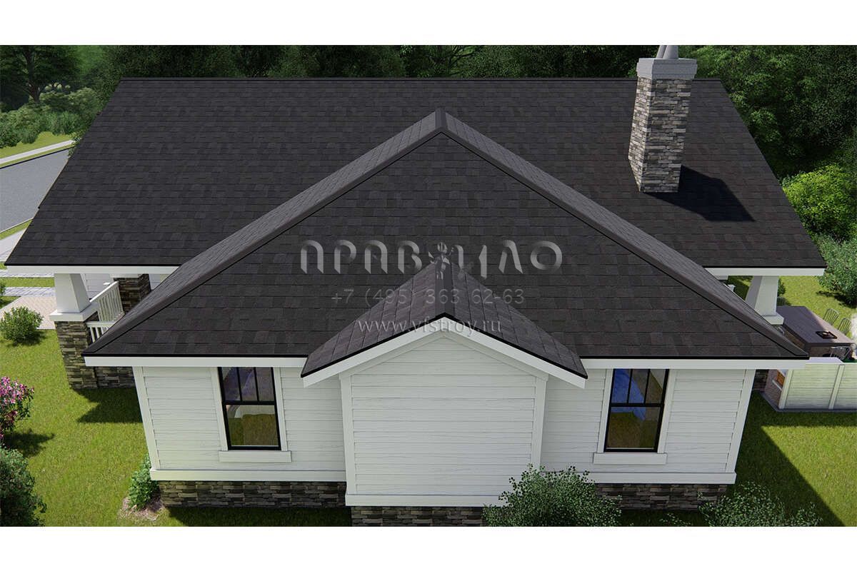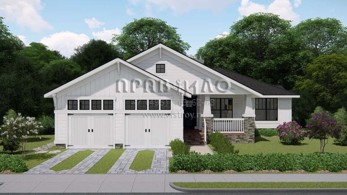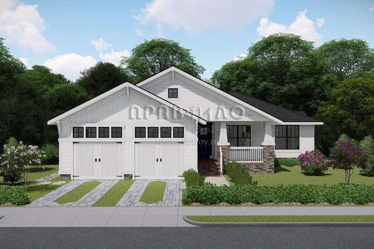 Это проект одноэтажного дома с гаражом на две машины жилой площадью 187 кв.м. Длина дома 18.3 м, ширина 18 м, высота 6.7 м. В доме три спальни и три санузла.
