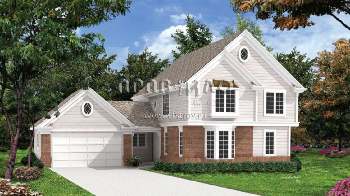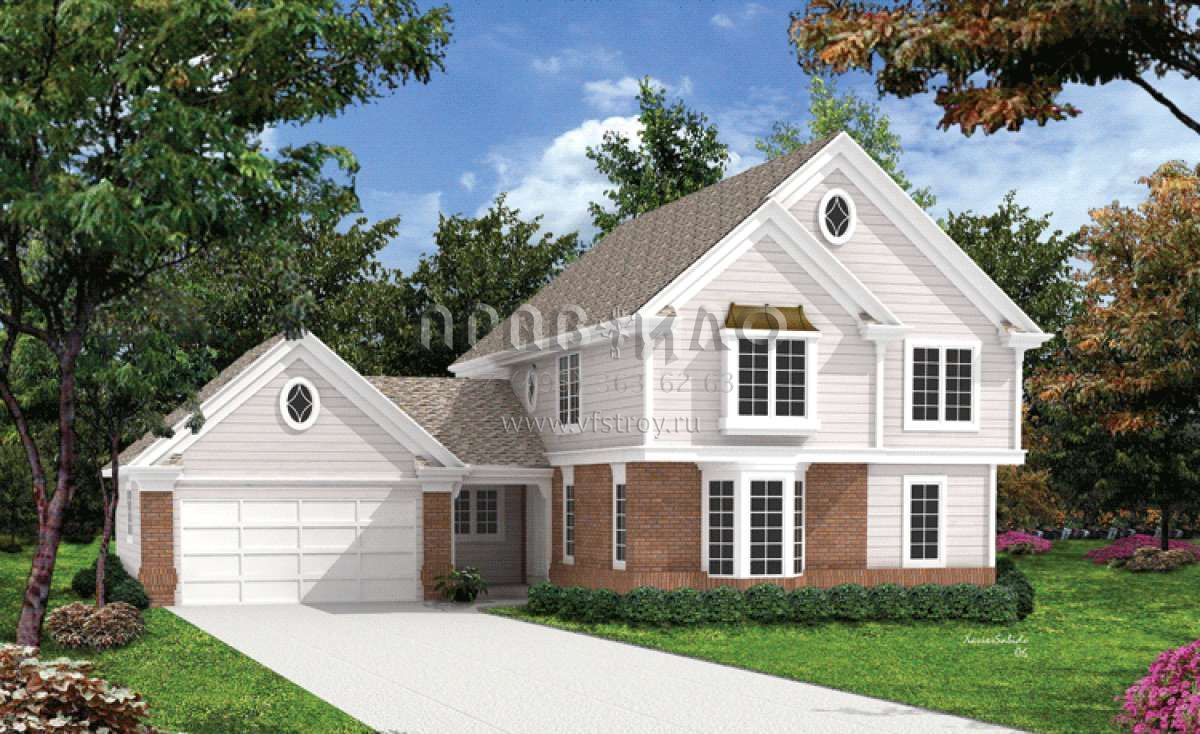 Это проект двухэтажного дома с гаражом на две машины жилой площадью 187 кв.м. Длина дома 11.9 м, ширина 16.2 м, высота 8.5 м. В доме пять спален и два санузла.