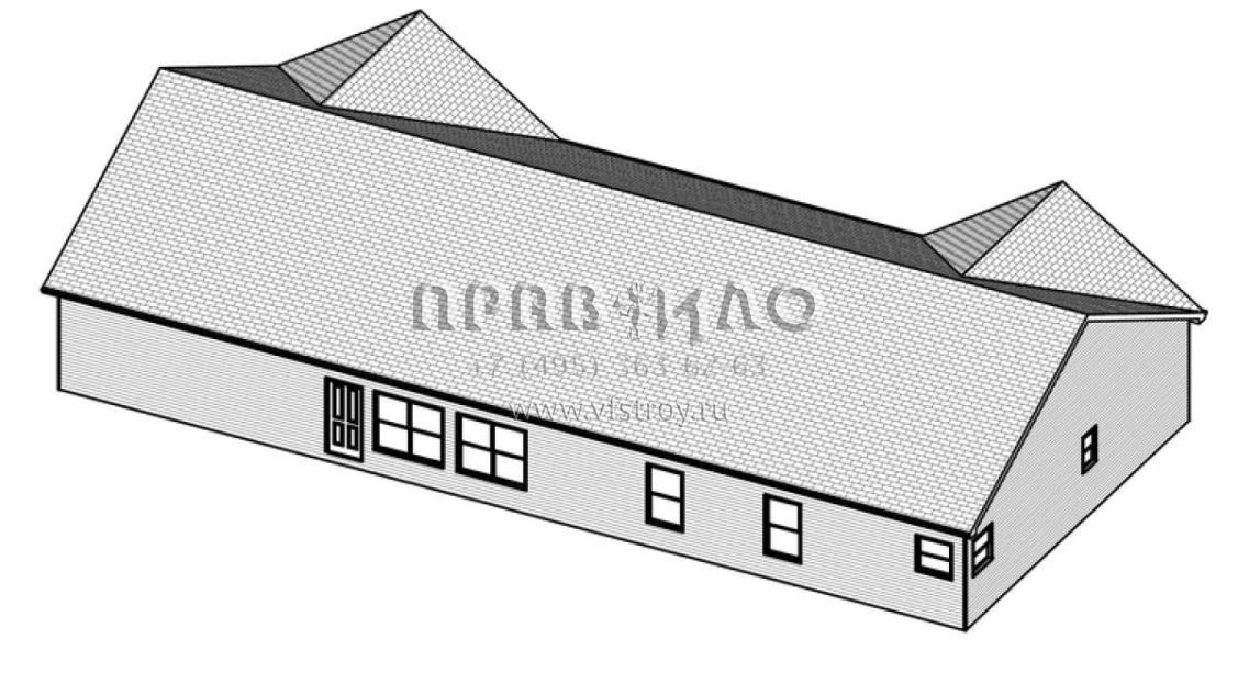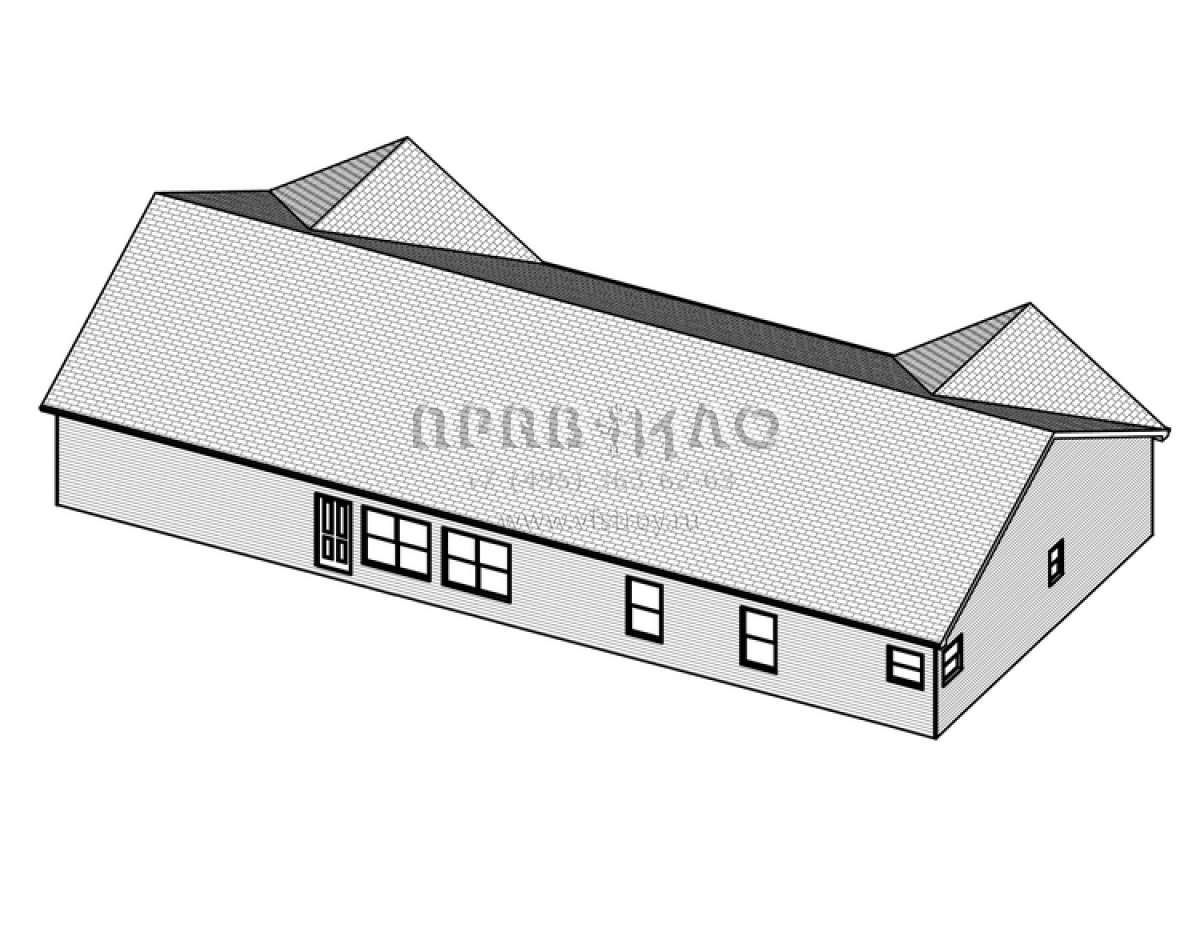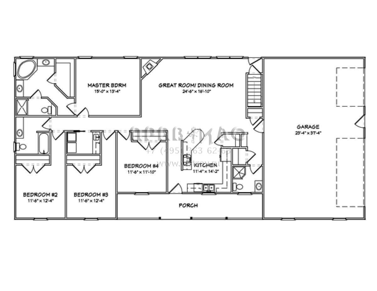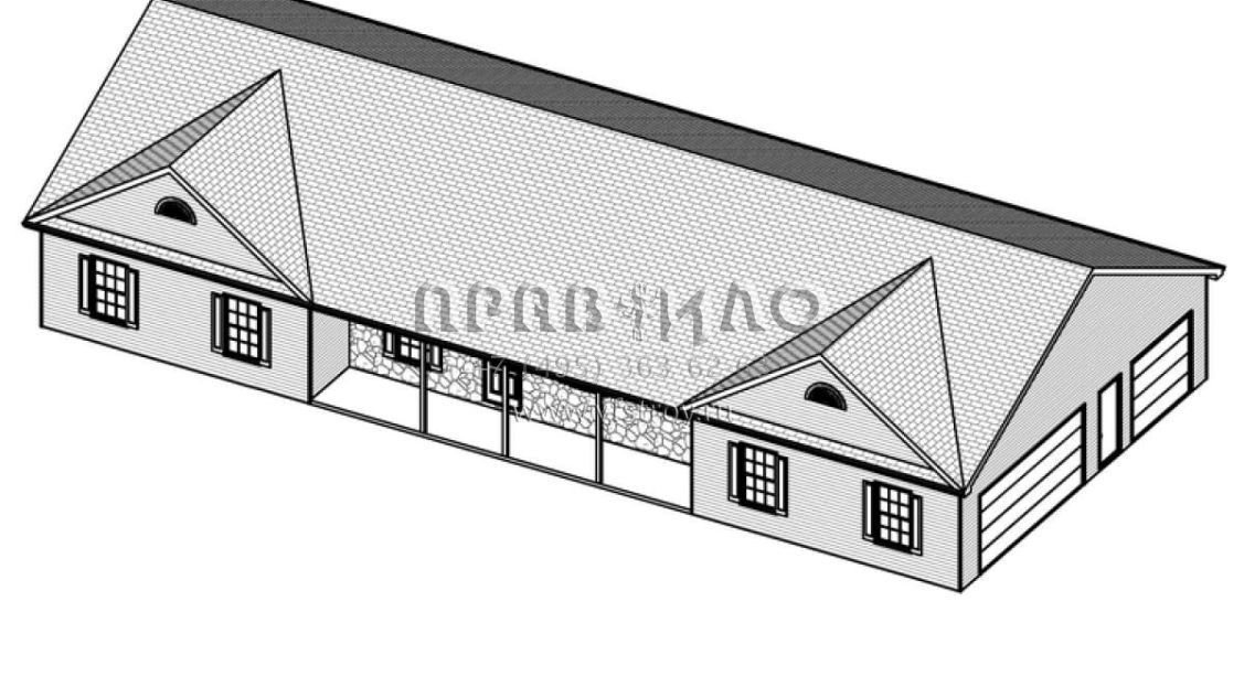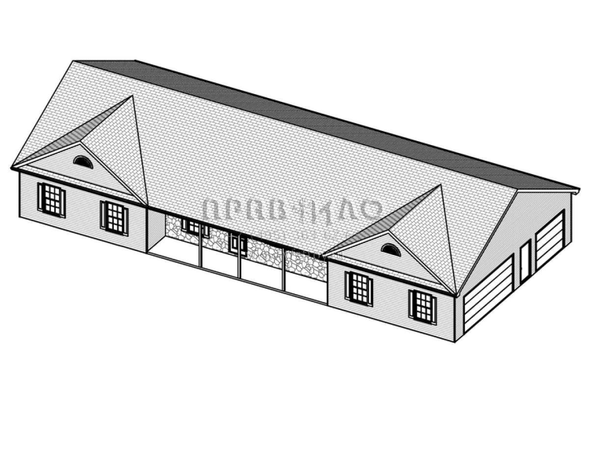 Это проект одноэтажного дома с гаражом на три и более машин жилой площадью 187 кв.м. Длина дома 11.6 м, ширина 25 м, высота 6.1 м. В доме четыре спальни и три санузла.