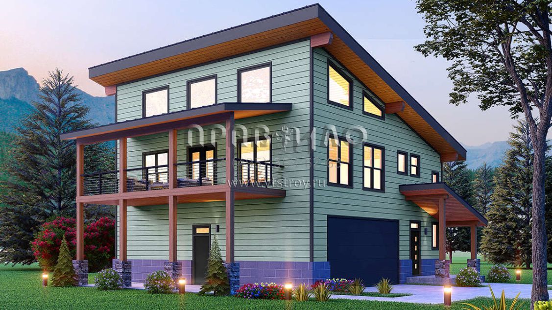 Это проект трехэтажного дома с гаражом на две машины жилой площадью 187 кв.м. Длина дома 11 м, ширина 11.3 м, высота 9.4 м. В доме две спальни и два санузла.
