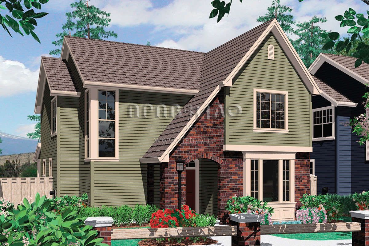 Двухэтажный проект дома позволяет рационально распорядиться площадью участка небольшого размера или узкой формы. На первом этаже находятся общие комнаты (гостиная/столовая, кухня, подсобные и технические помещения), на втором — спальни членов семьи.