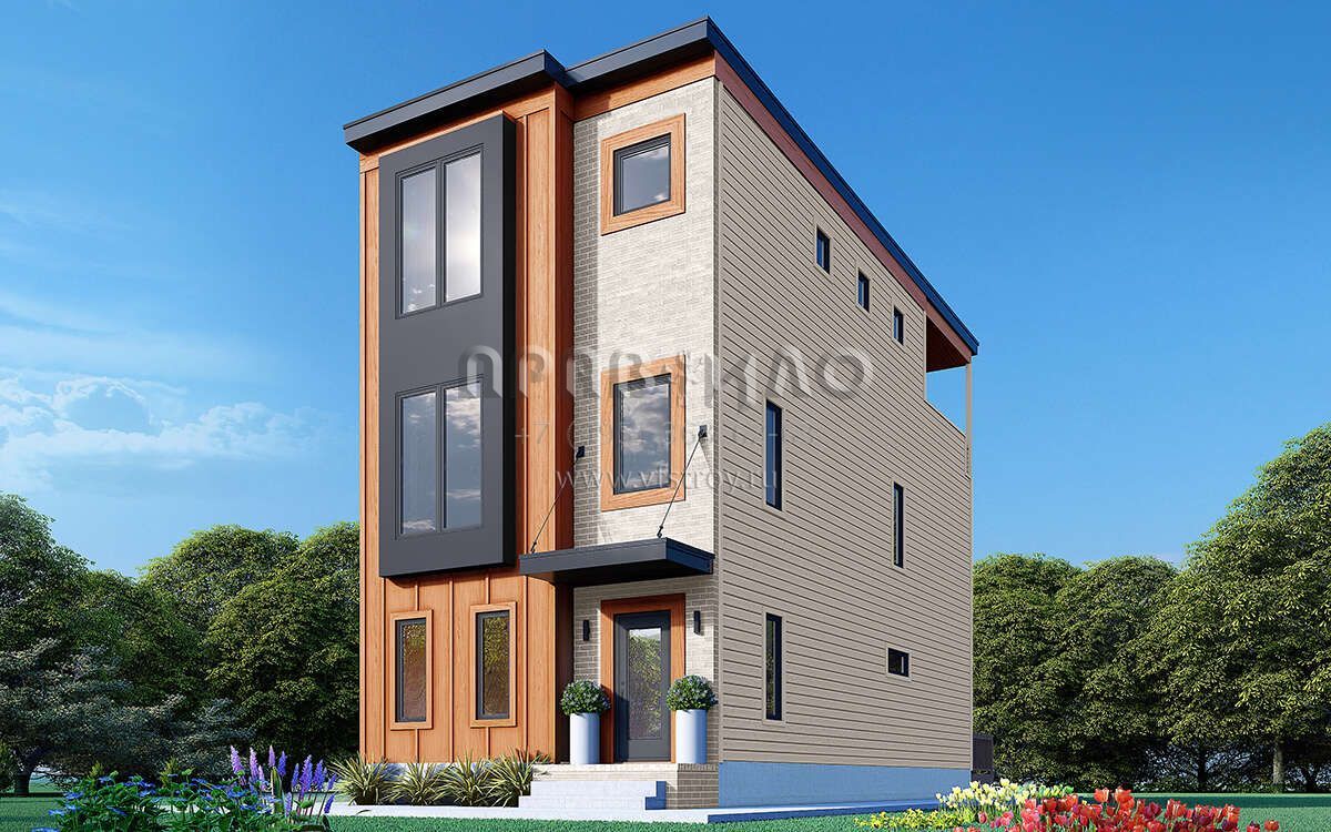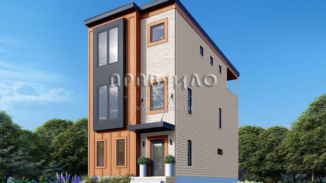 Это проект трехэтажного дома без гаража жилой площадью 188 кв.м. Длина дома 12.5 м, ширина 5.8 м, высота 9.4 м. В доме три спальни и три санузла.