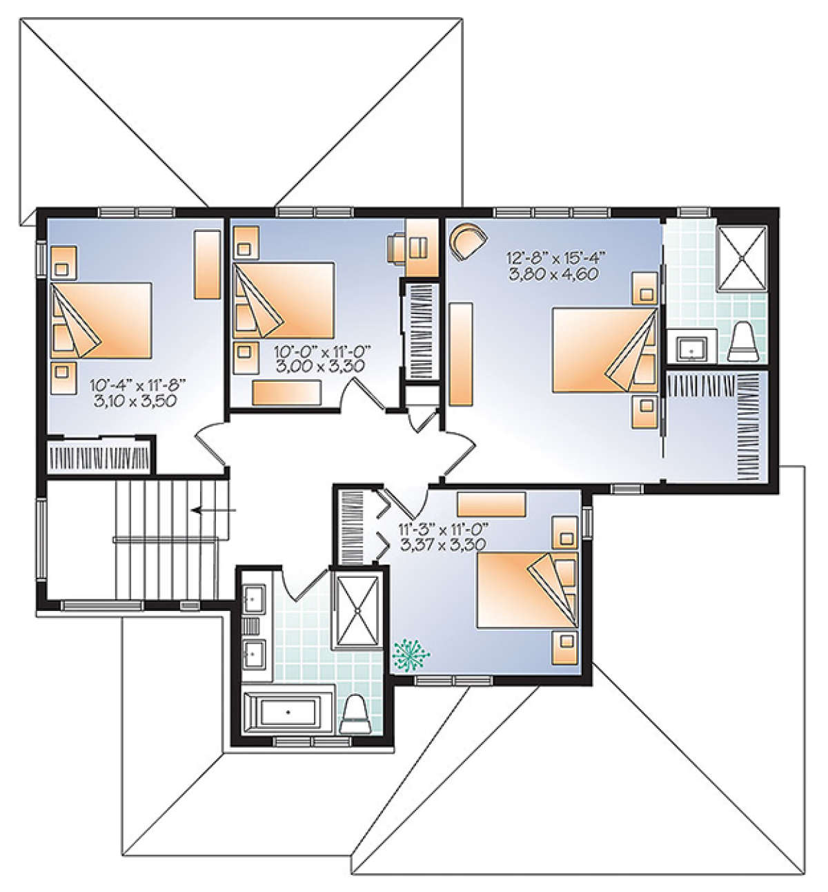 Это проект двухэтажного дома с гаражом на две машины жилой площадью 190 кв.м. Длина дома 11.6 м, ширина 13.4 м, высота 8.2 м. В доме четыре спальни и два санузла.