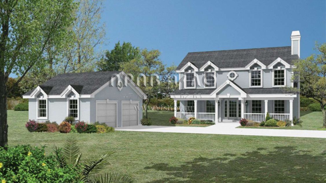 Это проект двухэтажного дома с гаражом на две машины жилой площадью 190 кв.м. Длина дома 11.6 м, ширина 11.6 м, высота 7.6 м. В доме три спальни и два санузла.