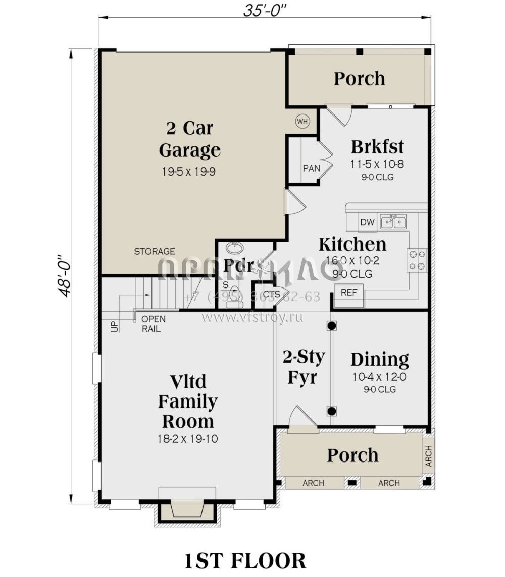 S5-191 (009-00123) Это иностранный проект, для которого требуется адаптация под нормы, действующие в Российской Федерации. Вы видите проект дома в стиле Ранчо. В этом доме сочетаются черты сельской постройки и аскетичность лофта. Внутри жильцы смогут проводить время с максимальным комфортом. Обратим внимание, что сейчас на планировках все размеры представлены в футах. Для перевода в метры вам необходимо значение в футах умножить на 0,3048.