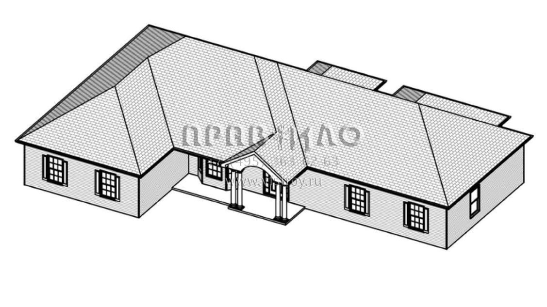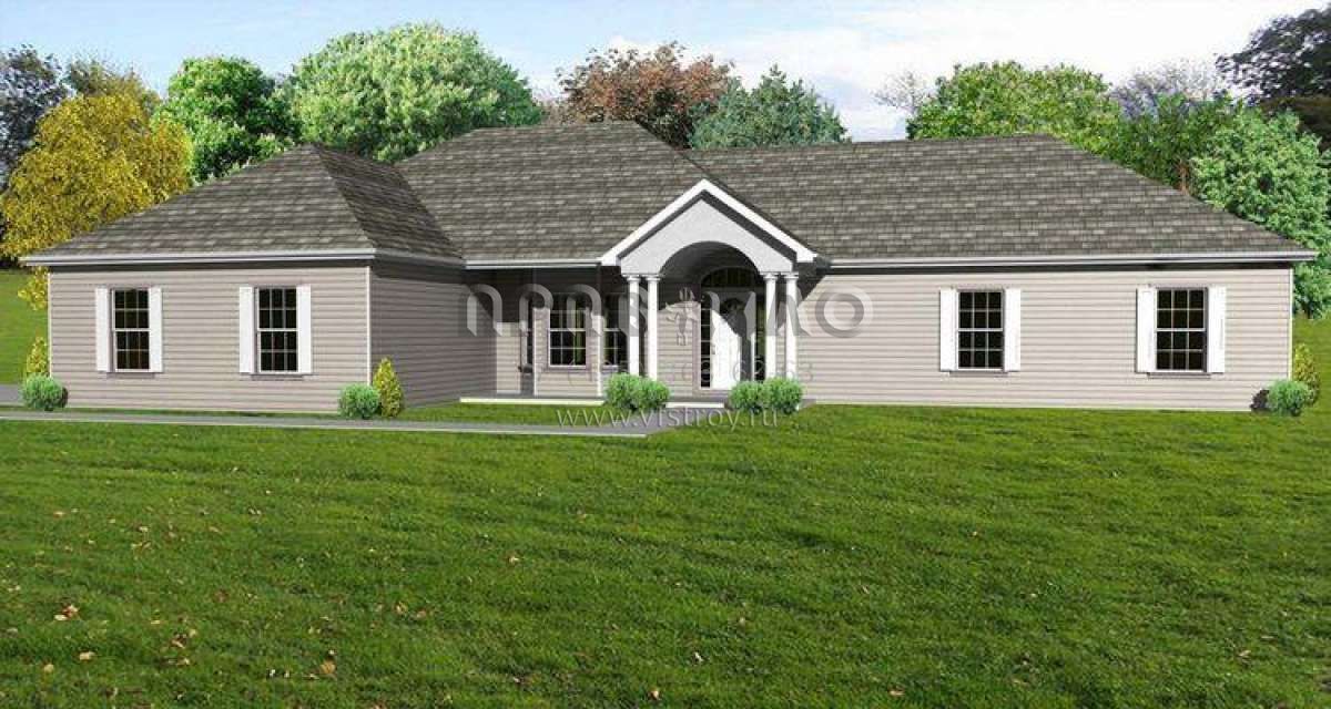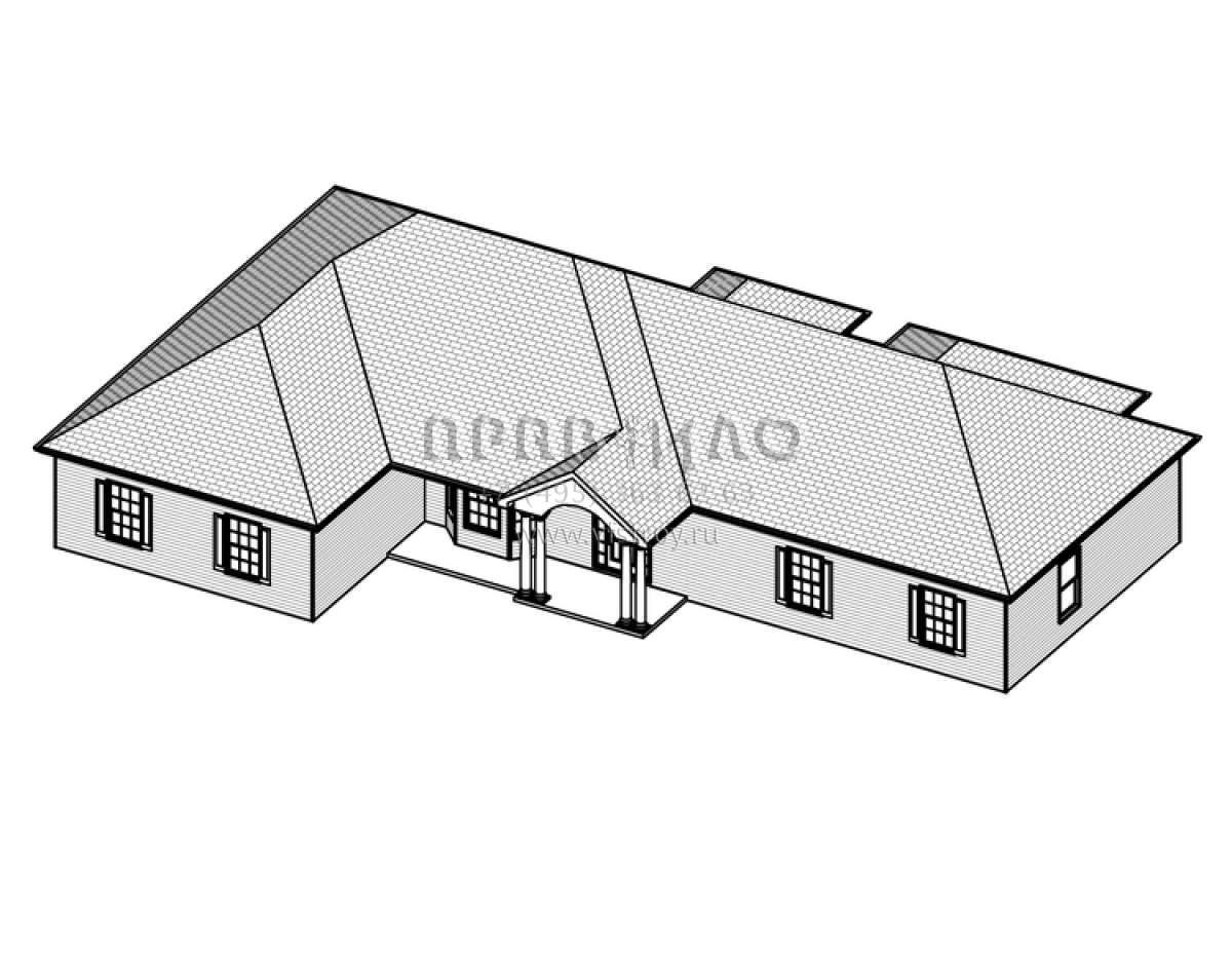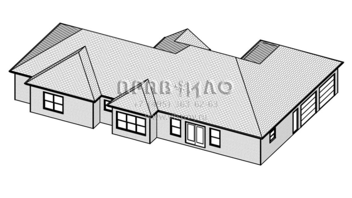 Это проект одноэтажного дома с гаражом на две машины жилой площадью 194 кв.м. Длина дома 15.2 м, ширина 23.8 м, высота 6.7 м. В доме три спальни и два санузла.