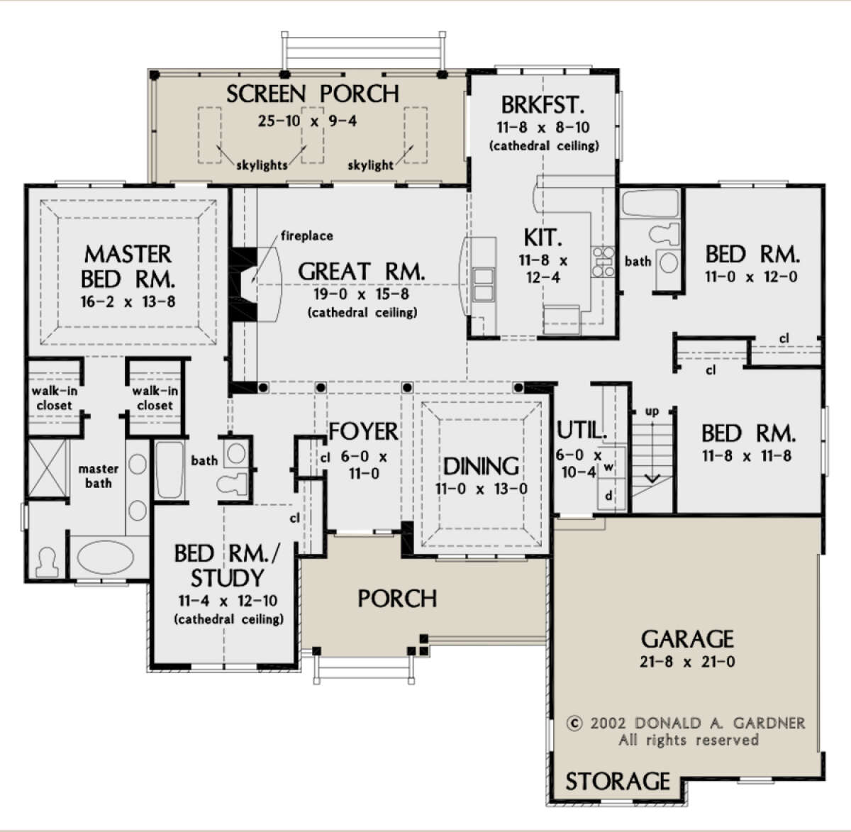 Это проект одноэтажного дома с гаражом на две машины жилой площадью 195 кв.м. Длина дома 18 м, ширина 19.5 м, высота 8.2 м. В доме четыре спальни и три санузла.