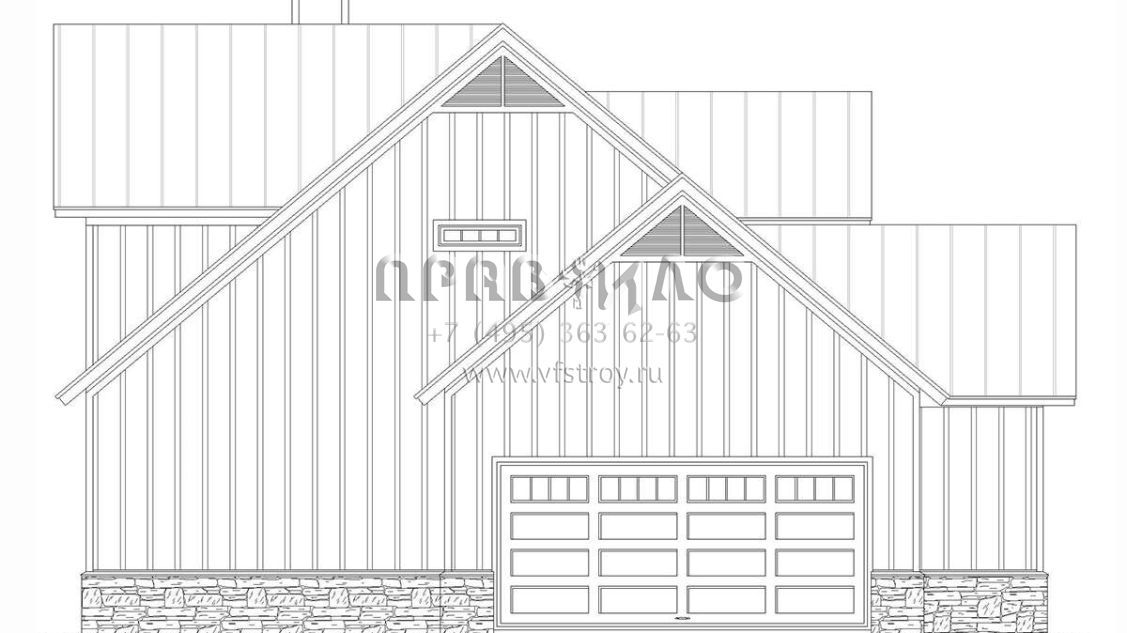 Это проект двухэтажного дома с гаражом на две машины жилой площадью 195 кв.м. Длина дома 22.9 м, ширина 14 м, высота 7.6 м. В доме три спальни и два санузла.