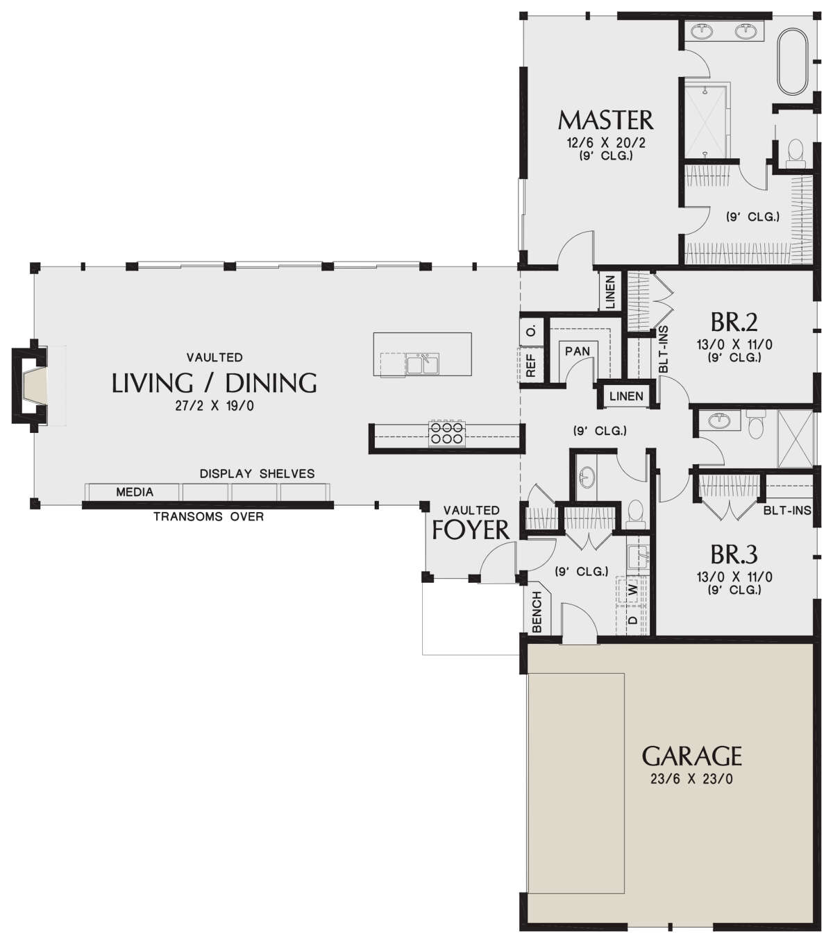 Это проект одноэтажного дома с гаражом на две машины жилой площадью 196 кв.м. Длина дома 22.9 м, ширина 19.5 м, высота 4.9 м. В доме три спальни и два санузла.