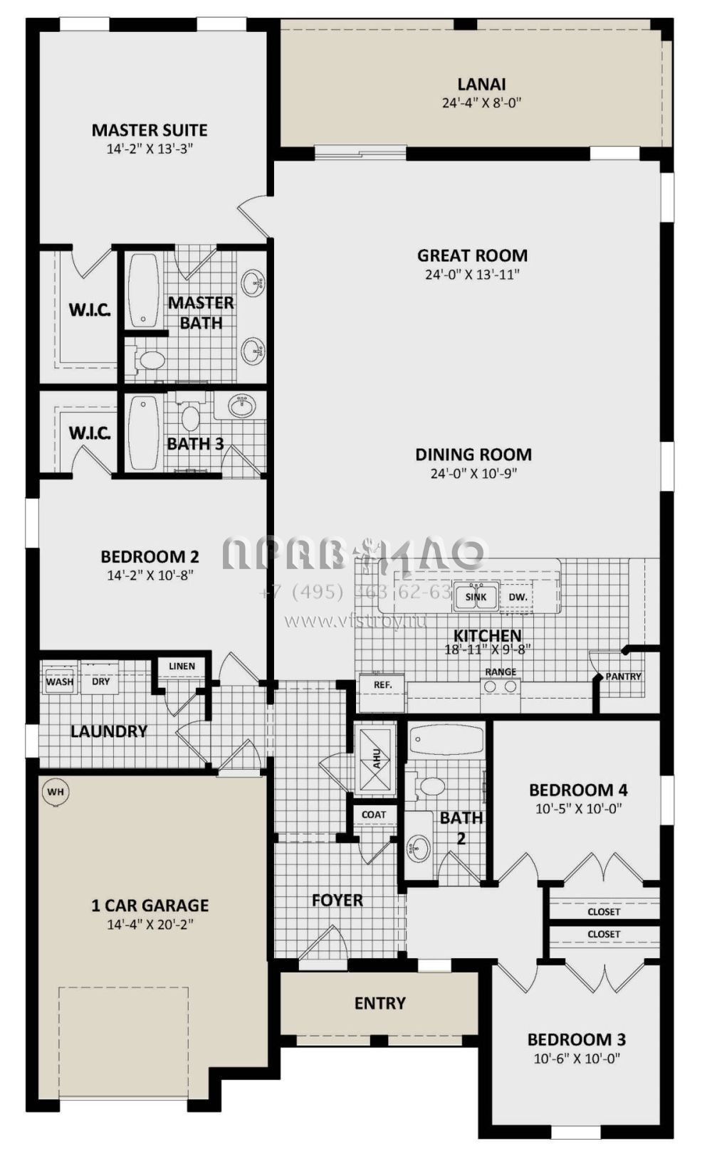 Это проект одноэтажного дома с гаражом на одну машину жилой площадью 196 кв.м. Длина дома 21 м, ширина 12.2 м, высота 5.2 м. В доме четыре спальни и три санузла.