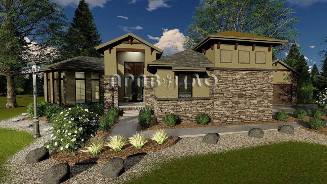 Это проект одноэтажного дома с гаражом на три и более машин жилой площадью 198 кв.м. Длина дома 21.9 м, ширина 26.2 м, высота 7.6 м. В доме одна спальня и один санузел.