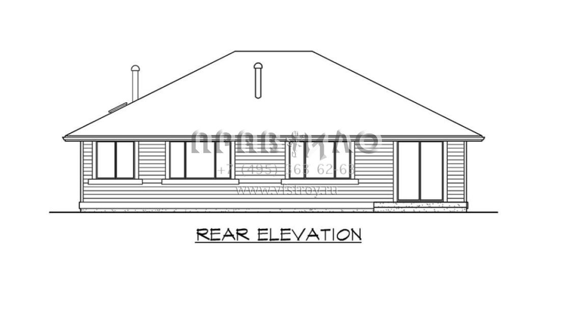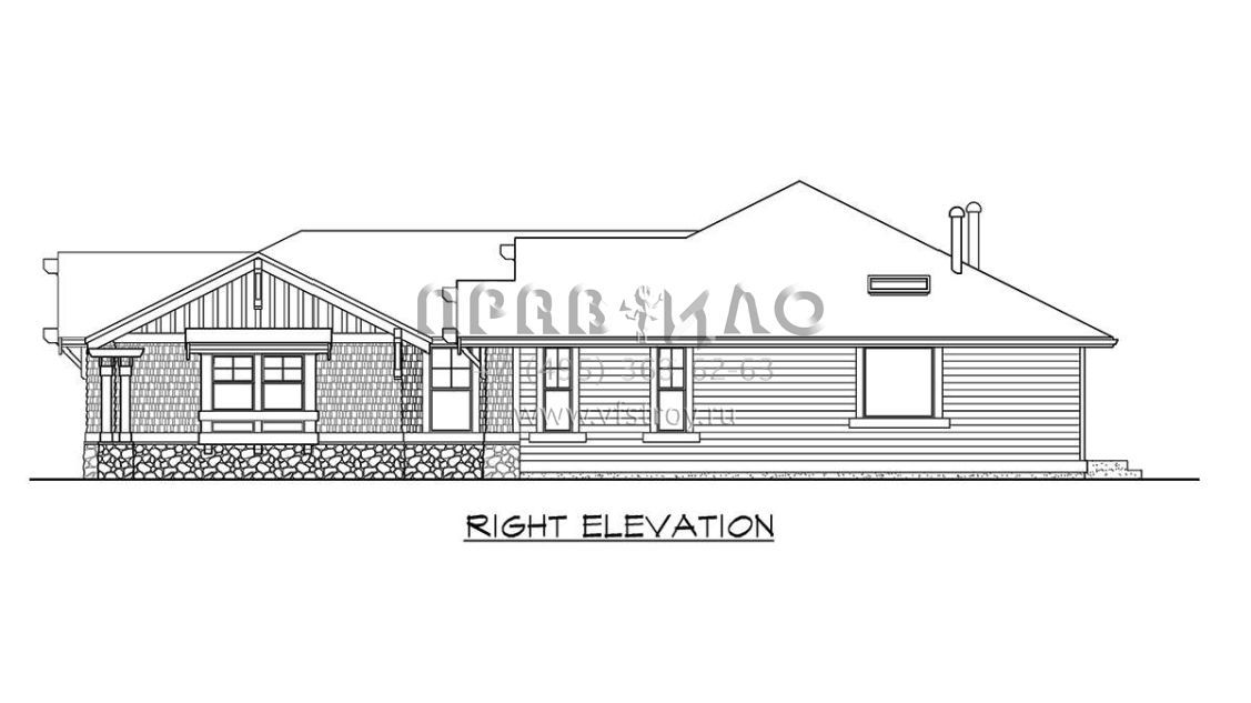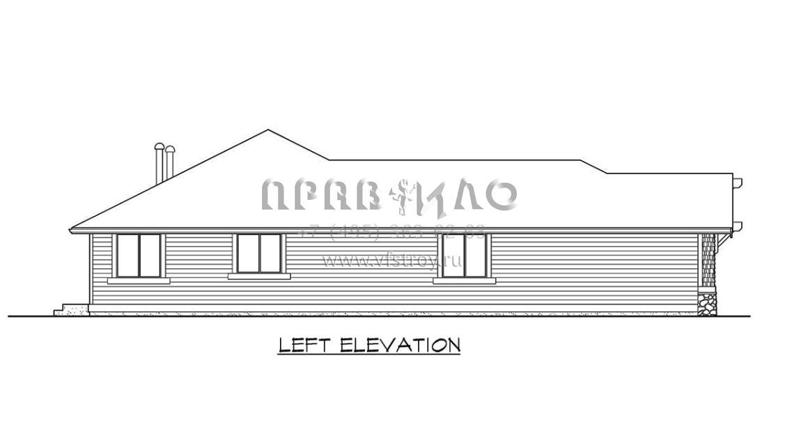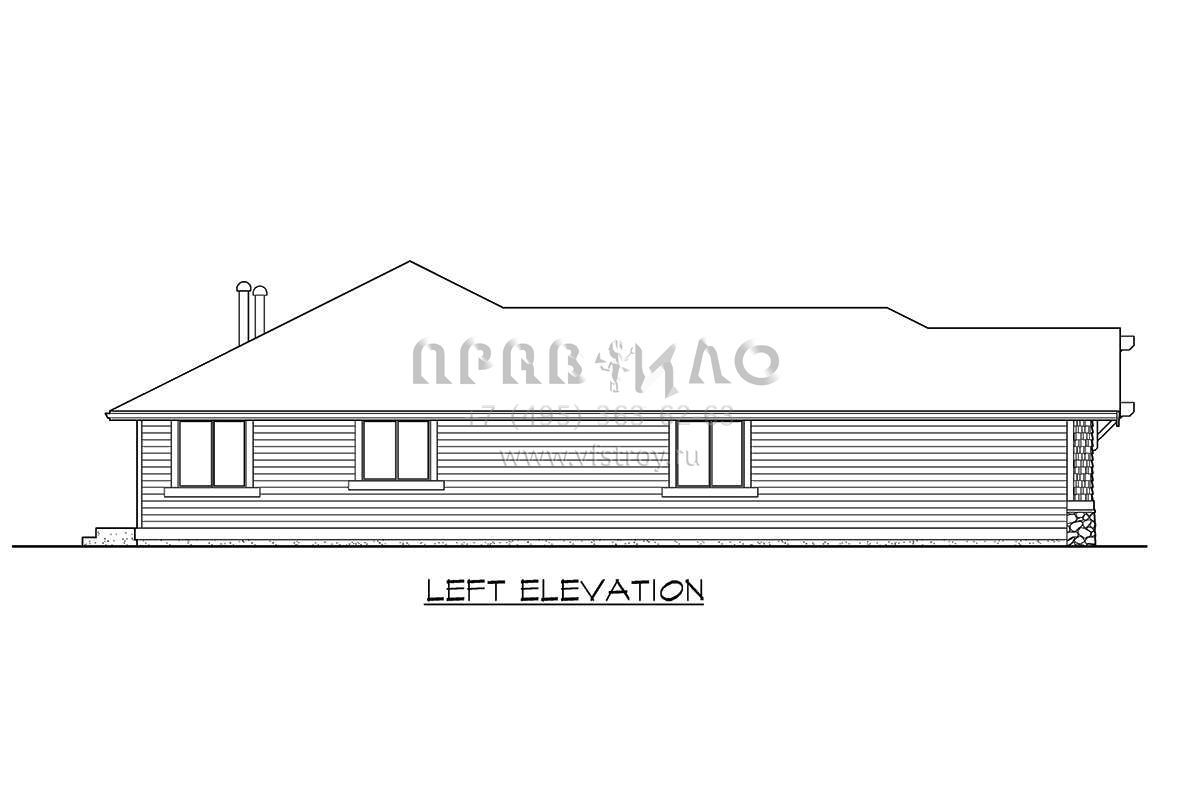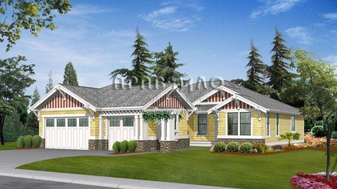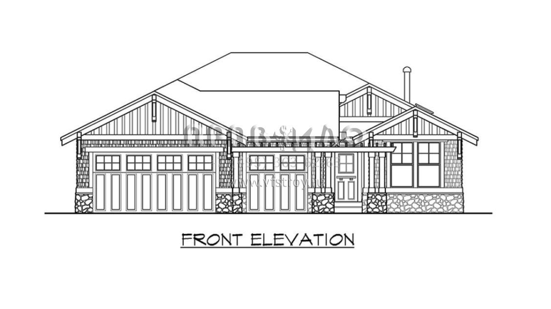 Это проект одноэтажного дома с гаражом на три и более машин жилой площадью 201 кв.м. Длина дома 21.3 м, ширина 15.2 м, высота 5.8 м. В доме три спальни и два санузла.