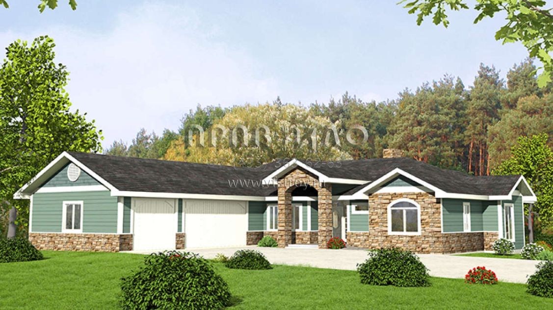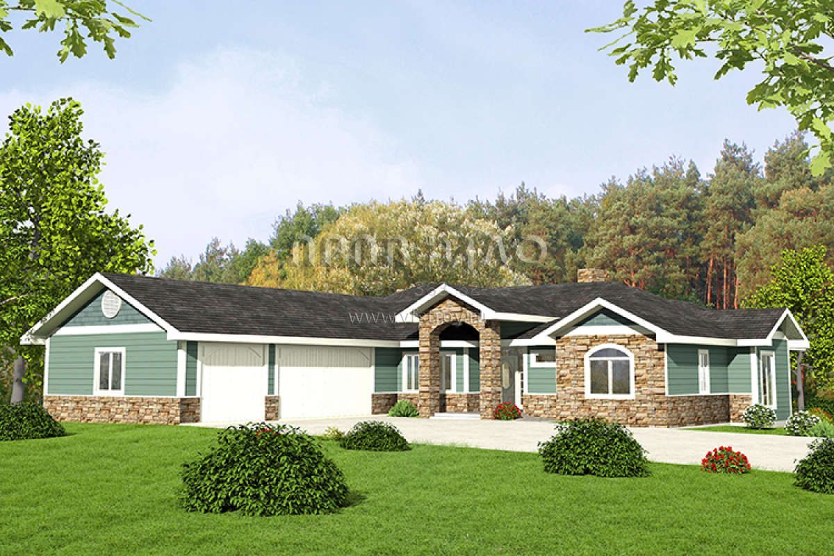 Это проект одноэтажного дома с гаражом на три и более машин жилой площадью 202 кв.м. Длина дома 24.7 м, ширина 18.3 м, высота 5.5 м. В доме две спальни и два санузла.