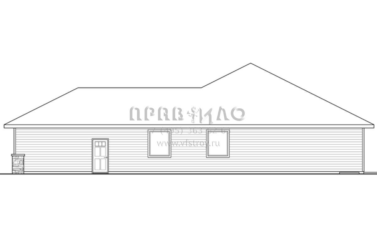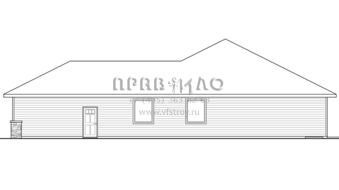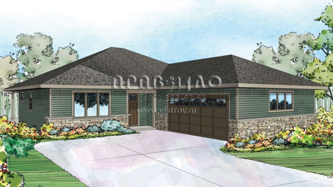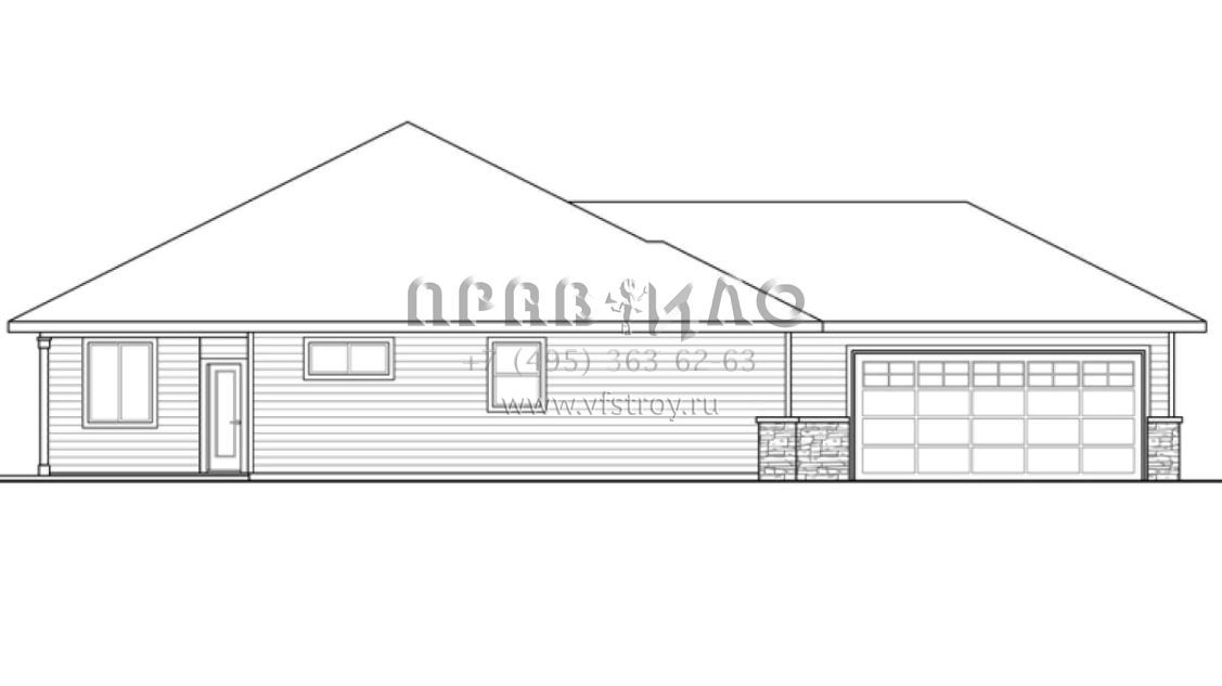 Это проект одноэтажного дома с гаражом на две машины жилой площадью 204 кв.м. Длина дома 21.6 м, ширина 15.2 м, высота 6.7 м. В доме три спальни и два санузла.